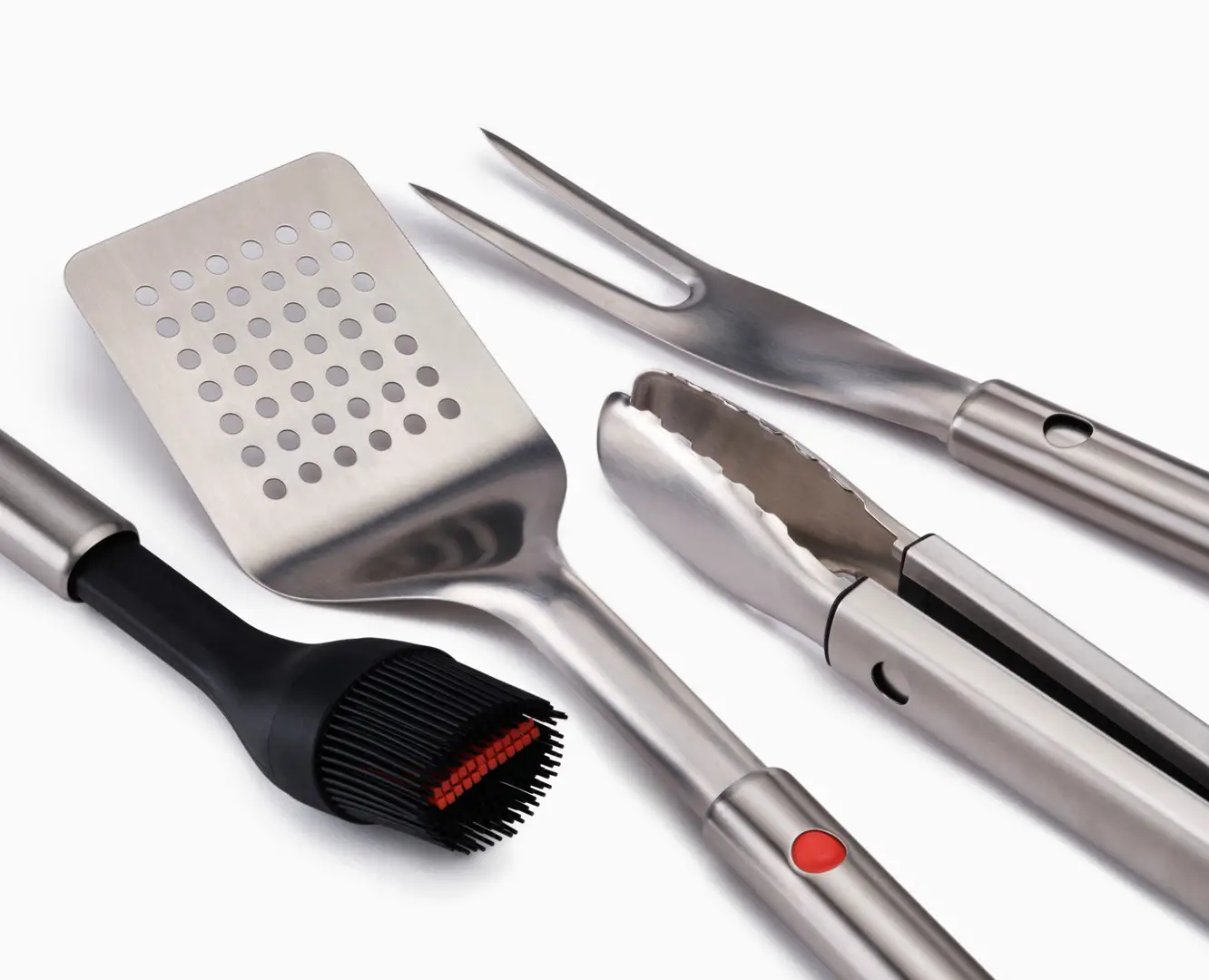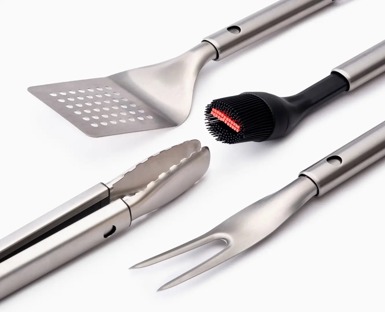 Prezentowany zestaw 4 narzędzi grillowych wykonano ze stali nierdzewnej, silikonu i tworzywa sztucznego. W komplecie znajdują się łopatka 41,8 x 9,5 x 3,4 cm, szczypce 42,6 x 3,7 x 4,2 cm, widelec 41,8 x 3,6 x 2,2 cm i pędzel 34,9 x 5,1 x 6,2 cm. Świetnie sprawdzą się one do przewracania, marynowania i nakładania grillowanej żywności oraz dodatków w postaci np. sałatek. Łopatka posiada otwory ułatwiające odprowadzanie nadmiaru tłuszczu, pędzel ma druciane włosie, a szczypce wyposażono w blokadę ramion. Wszystkie produkty posiadają wysuwane głowice i części uchwytów. Dodatkowo mają one również praktyczne pętelki do zawieszenia na haczykach obok grilla lub w kuchni. Zestaw nadaje się do mycia w zmywarce. W komplecie dołączono pokrowiec do przechowywania, które należy czyścić wilgotną ściereczką.