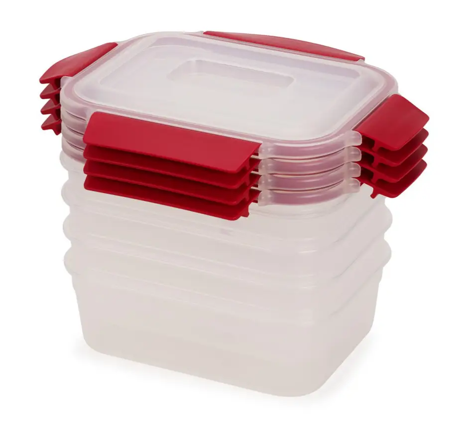 Prezentowany 8-elementowy zestaw z kolekcji Red Nest Lock zawiera 4 pojemniki prostokątne o pojemności 1,1 L. Wykonano je z tworzywa sztucznego bez BPA. Pojemniki świetnie sprawdzą się do przechowywania żywności tak by zachować jej świeżość na dłużej. Nadadzą się również do zabierania jedzenia do pracy czy na wycieczkę. Każdy pojemnik posiada pokrywkę z klipsami umożliwiającą szczelne zamknięcie. Nieużywany zestaw można łatwo przechowywać pokrywki łącząc razem, a pojemniki umieszczając jeden w drugim - oszczędzi to miejsce i ułatwi zachowanie porządku w kuchni. Produkt nadaje się do używania w mikrofalówce i zamrażarce oraz do mycia w zmywarce (górna półka).