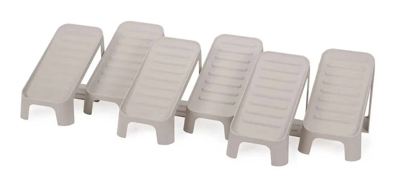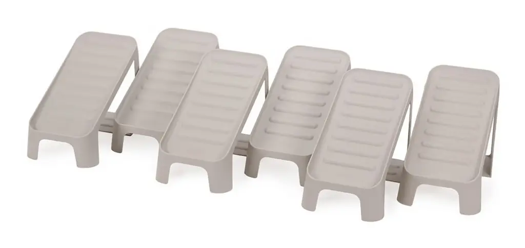 Prezentowany zestaw 6 organizerów na buty Shoe-in o wymiarach 18,7 x 14,7 x 26,2 cm (wys. x szer. x gł.) pozwoli na wygodne przechowywanie sześciu par obuwia do rozmiaru 48. Piętrowa, pochyła konstrukcja z podnoszonym elementem sprawia, że można zaoszczędzić miejsce w korytarzu. Dodatkowo oddziela ona buty od siebie, zapobiegając ich ocieraniu się co mogłoby powodować uszkodzenia. Żłobkowana powierzchnia organizerów zapewnia natomiast odpowiednią stabilizację - obuwie nie ześlizguje się. Produkt wykonano z tworzywa sztucznego w 40% pochodzącego z recyklingu i ma on kremowy kolor. By oczyścić zestaw z zabrudzeń należy przecierać go wilgotną ściereczką.