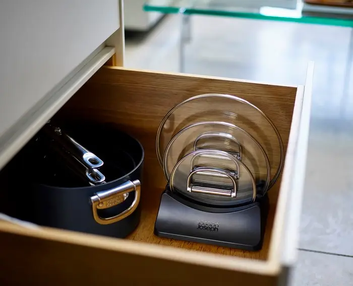 Joseph Joseph - Zestaw rondli ze składanymi uchwytami + pokrywki + podstawka Space