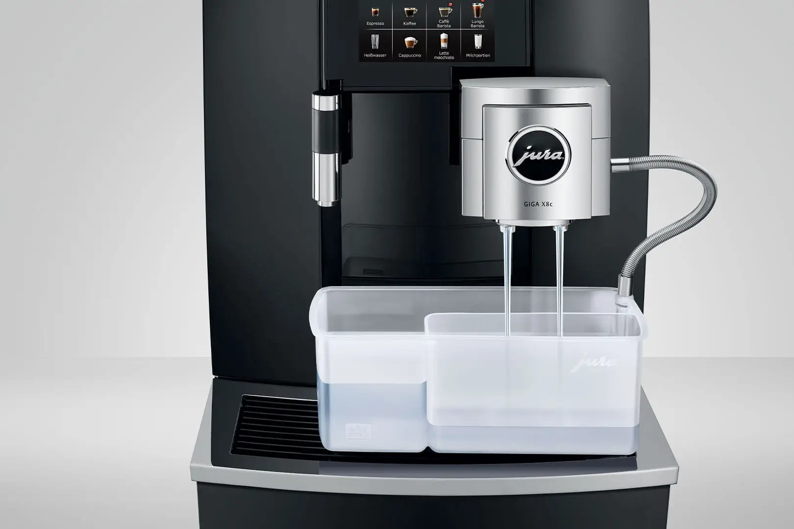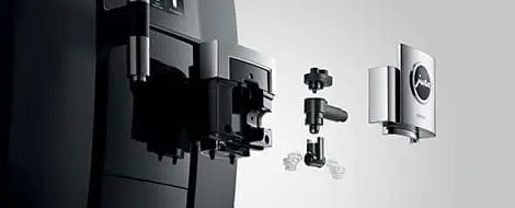 Konserwacja nowego ekspresu GIGA X8c jest tak samo prosta, logiczna i intuicyjna, jak jego obsługa. Oryginalne produkty do konserwacji JURA oraz zintegrowane programy płukania i czyszczenia dbają za naciśnięciem jednego przycisku o higienę, posiadającą certyfikat TÜV. Również czyszczenie systemu mlecznego wyróżnia się przemyślaną konstrukcją. W pełni zautomatyzowane i uruchamiane za dotknięciem wyświetlacza gwarantuje zachowanie perfekcyjnej czystości w kontakcie z mlekiem. Masywna podwójna wylewka da się rozłożyć paroma ruchami. Umieszczone z przodu wylewki wyloty przewodów na mleko są łatwo dostępne i w razie potrzeby można je wymienić w bardzo prosty sposób.