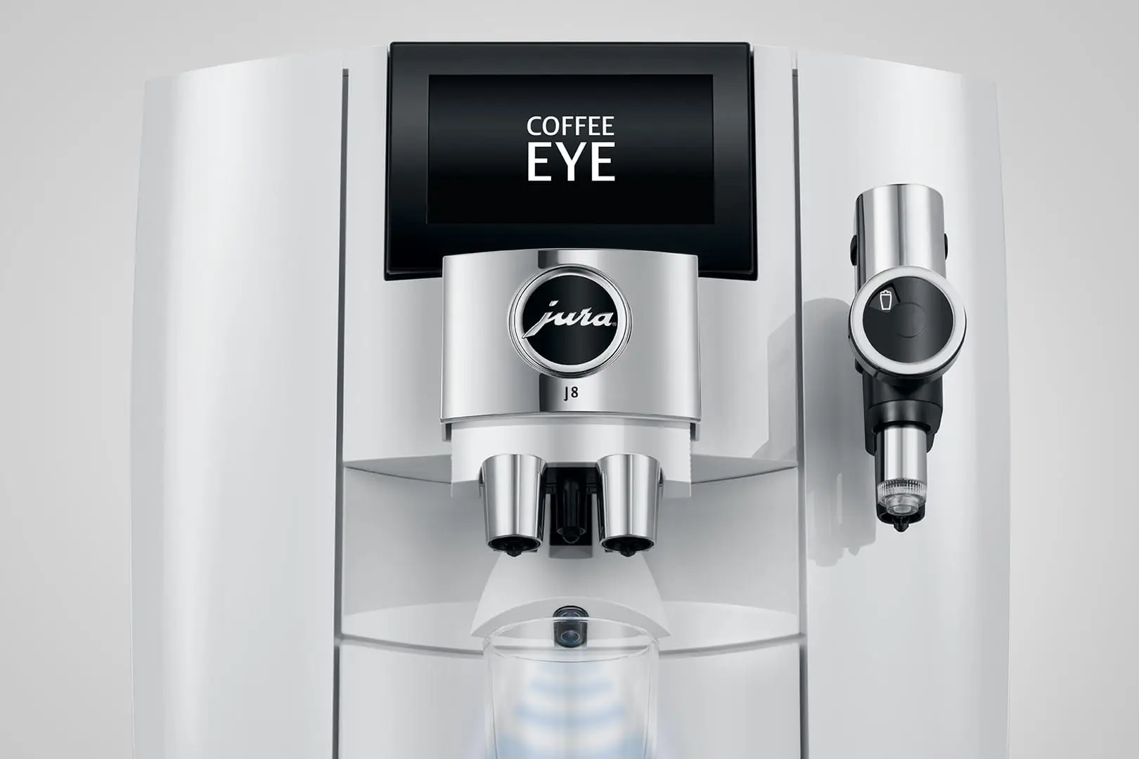 Aby obsługa była jeszcze wygodniejsza, Coffee Eye rozpoznaje położenie filiżanki i automatycznie dopasowuje do niego specjały dostępne do wyboru na wyświetlaczu. Prościej już nie można. Nawet jeśli chodzi o konserwację: dzięki czyszczeniu systemu mlecznego za pomocą funkcji One-Touch przebiega ono błyskawicznie za naciśnięciem jednego przycisku. Wartości wewnętrzne znajdują odzwierciedlenie w formie zewnętrznej. Doskonałe wzornictwo nadaje ekspresowi J8 charakterystyczne oblicze.