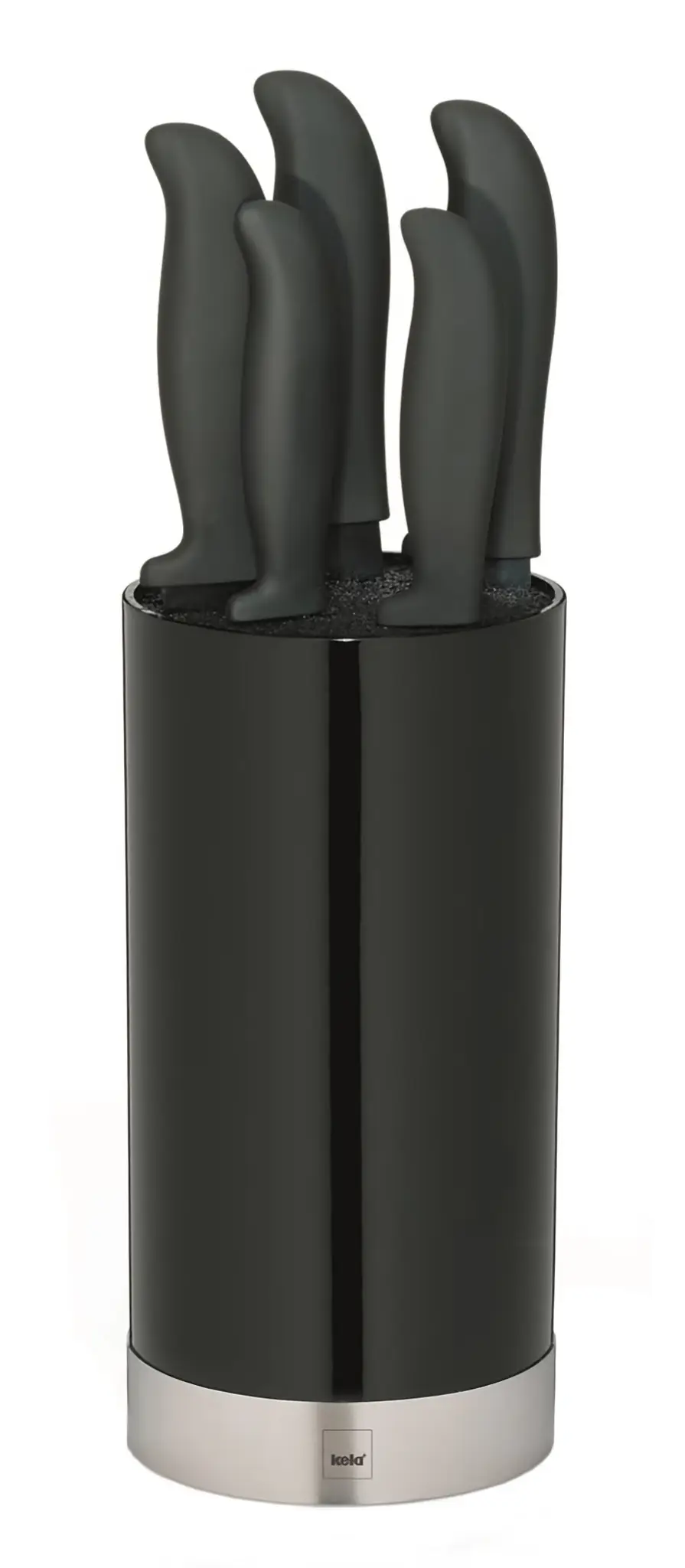 Prezentowany zestaw w czarnym kolorze zawiera 5 noży oraz blok do ich przechowywania. W komplecie znajdują się: nóż kuchenny dł. 19,5 cm, nóż do kości dł. 24 cm, nóż do chleba dł. 32 cm, nóż do mięsa dł. 32 cm i nóż szefa kuchni dł. 32 cm. Ich ostrza wykonano ze stali pokrytej powłoką nieprzywierającą, dzięki czemu żywność nie przywiera do ich powierzchni, a same noże są chronione przed korozją. Ergonomiczne uchwyty wykonano natomiast z tworzywa sztucznego. Należy je myć wyłącznie ręcznie. Dołączony w komplecie wykonany z tworzywa blok o wymiarach 11 x 34,5 cm (śr. x wys.) pozwoli na łatwe przechowywanie noży tak by były łatwo dostępne. Wyposażono go w wyjmowaną plastikową wkładkę, która nadaje się do mycia w zmywarce.