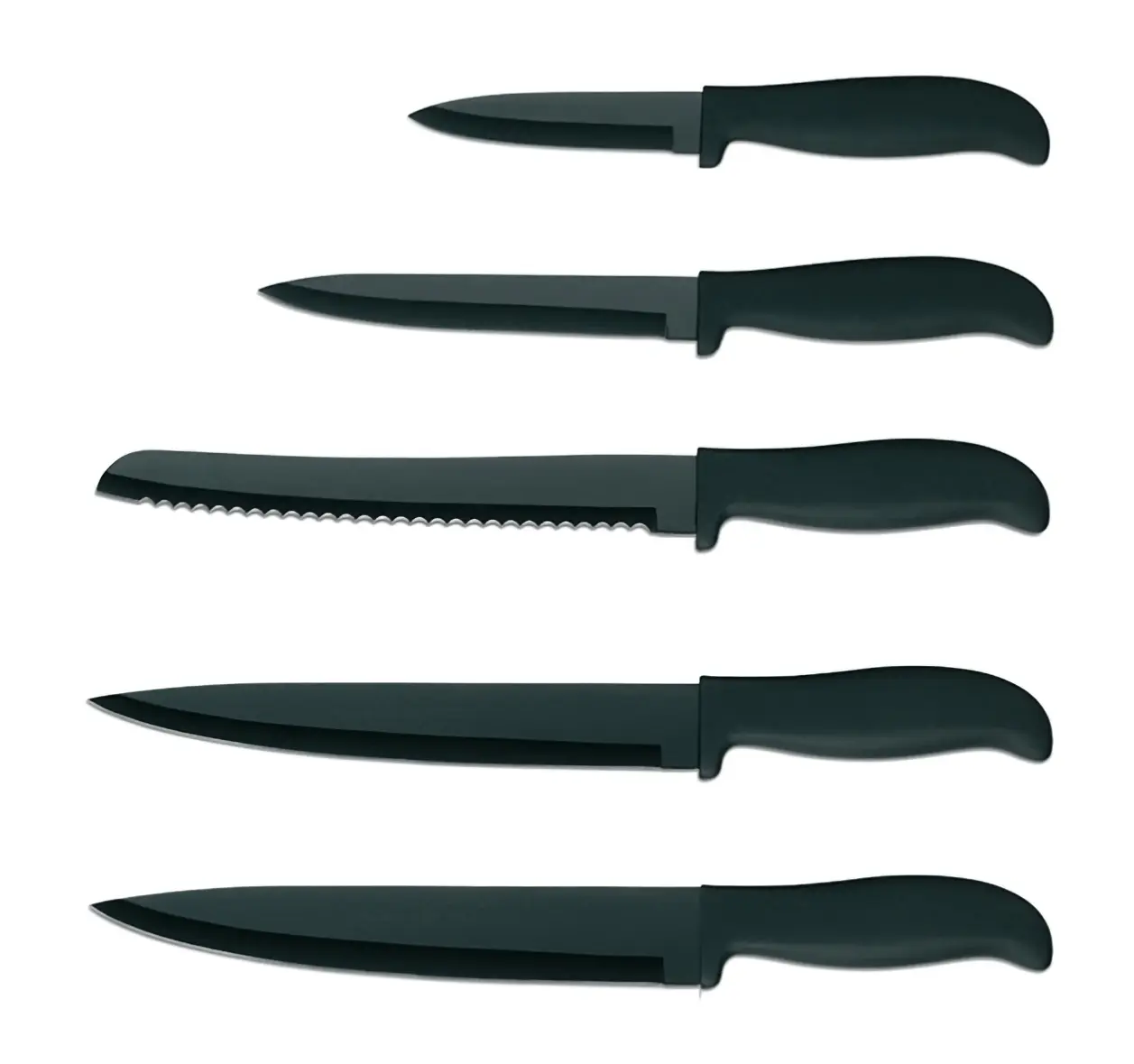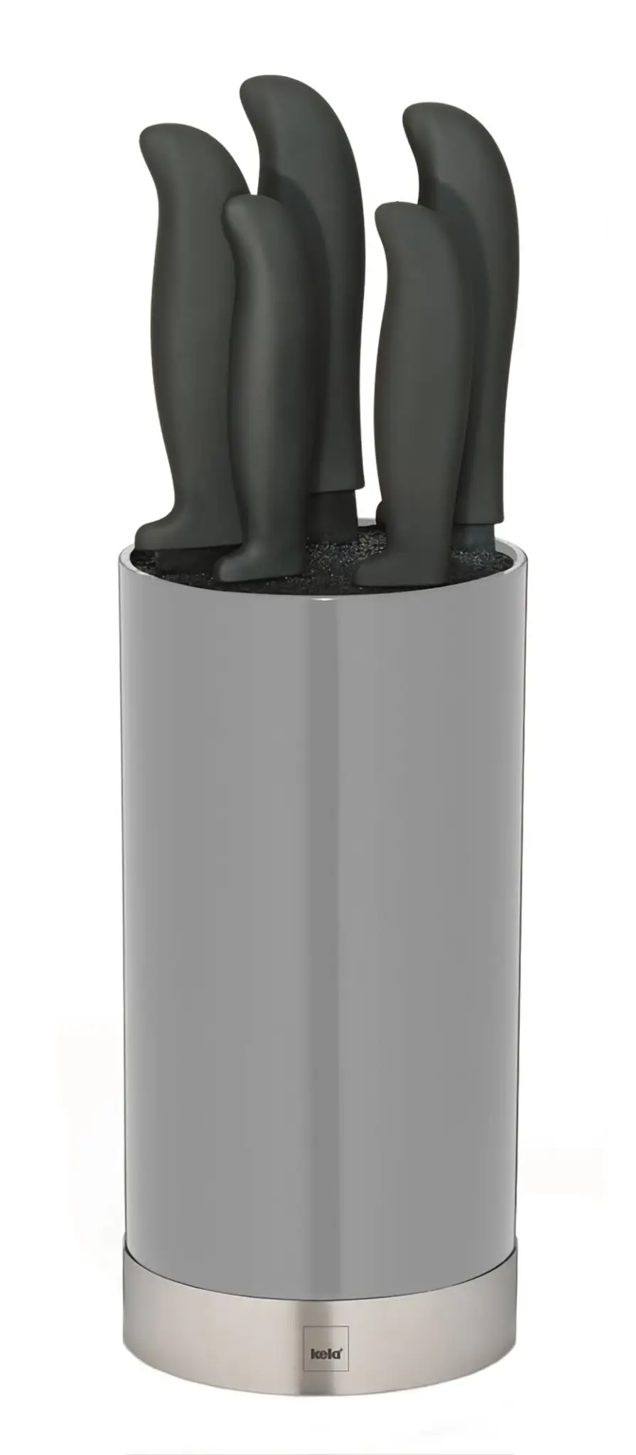 Prezentowany zestaw w szaro-czarnej kolorystyce zawiera 5 noży oraz blok do ich przechowywania. W komplecie znajdują się: nóż kuchenny dł. 19,5 cm, nóż do kości dł. 24 cm, nóż do chleba dł. 32 cm, nóż do mięsa dł. 32 cm i nóż szefa kuchni dł. 32 cm. Ich ostrza wykonano ze stali pokrytej powłoką nieprzywierającą, dzięki czemu żywność nie przywiera do ich powierzchni, a same noże są chronione przed korozją. Ergonomiczne uchwyty wykonano natomiast z tworzywa sztucznego. Należy je myć wyłącznie ręcznie. Dołączony w komplecie wykonany z tworzywa blok o wymiarach 11 x 34,5 cm (śr. x wys.) pozwoli na łatwe przechowywanie noży tak by były łatwo dostępne. Wyposażono go w wyjmowaną plastikową wkładkę, która nadaje się do mycia w zmywarce.