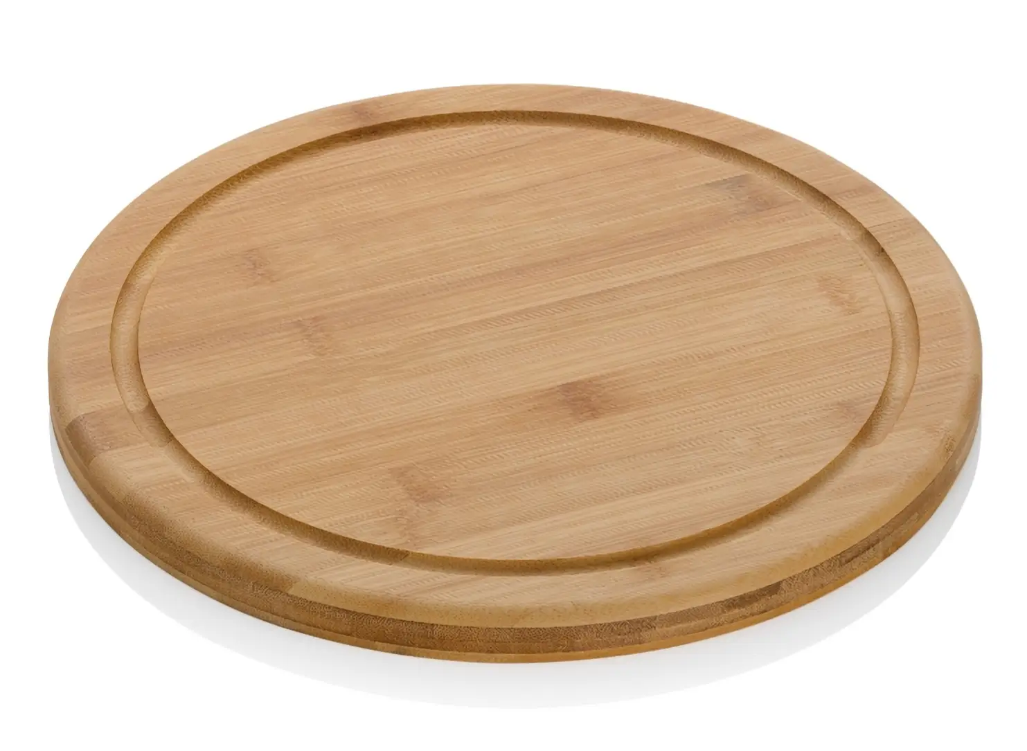 Prezentowana okrągła deska do krojenia ma wymiary 30 x 1,8 cm (śr. x wys.). Wykonano ją z drewna bambusa w naturalnym brązowym kolorze. Materiał ten sprawia, że deska jest wytrzymała, odporna na przecięcia i lekka, dzięki czemu idealnie nada się ona do krojenia warzyw, owoców, mięsa, sera czy chleba. Praktyczny rowek zbierający ograniczy bałagan, wyłapując soki i okruszki. Można będzie na niej również serwować m.in. kanapki i przekąski. Deskę należy myć wyłącznie ręcznie pod letnią wodą i dokładnie osuszać. Od czasu do czasu olejować.