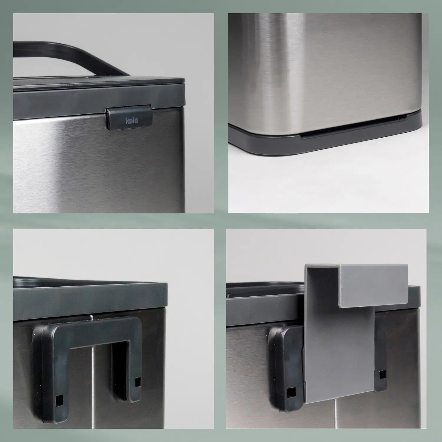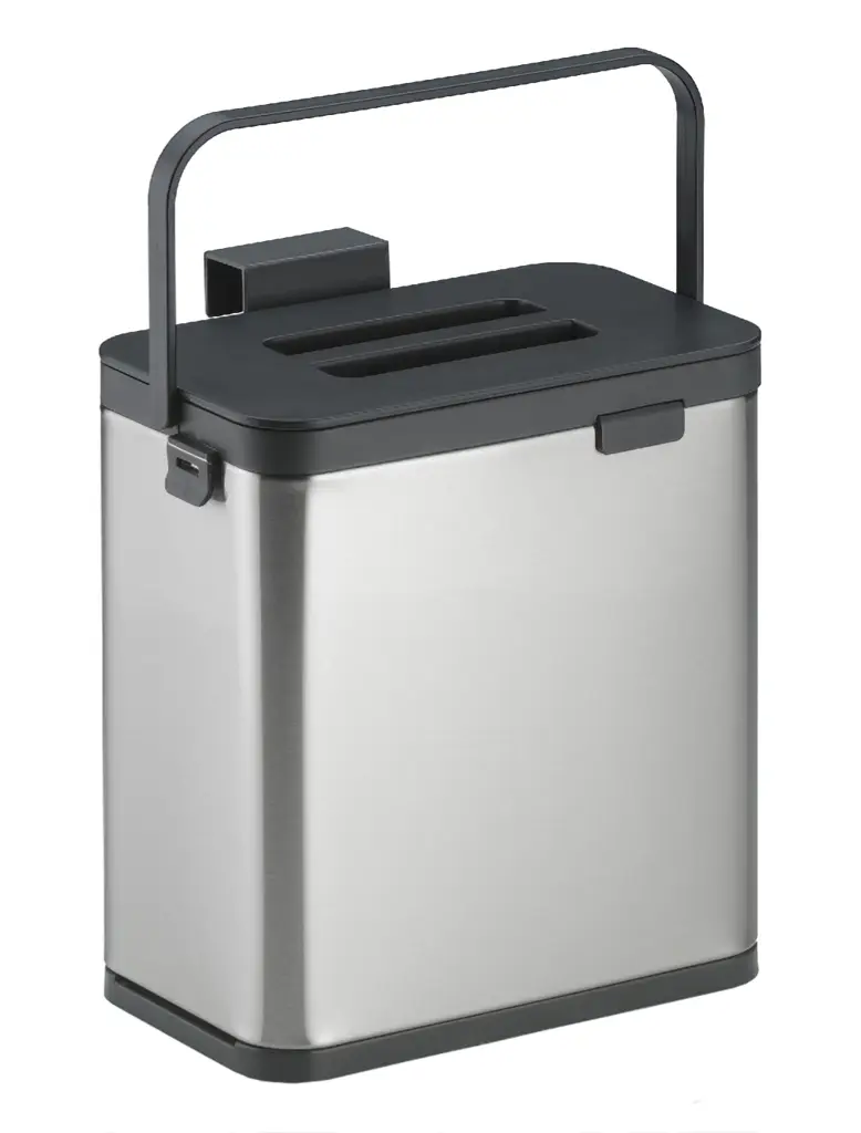 Prezentowany kompostownik z pokrywką z linii Plata o wymiarach 20,5 x 13 x 21 cm (dł. x szer. x wys.) i pojemności 2,1 L wykonano ze stali nierdzewnej (obudowa) oraz tworzywa sztucznego (pojemnik). Przeznaczony jest on na odpady organiczne w postaci resztek owoców, warzyw, skorupek jajek itp.. Odporność na odbicia palców sprawia, że estetycznie się on prezentuje, a możliwość wyjęcia wewnętrznego pojemnika z uchwytem zapewnia łatwość opróżniania. Kompostownik nadaje się do postawienia na blacie lub zawieszenia na krawędzi drzwiczek / szuflady. Należy go myć ręcznie.