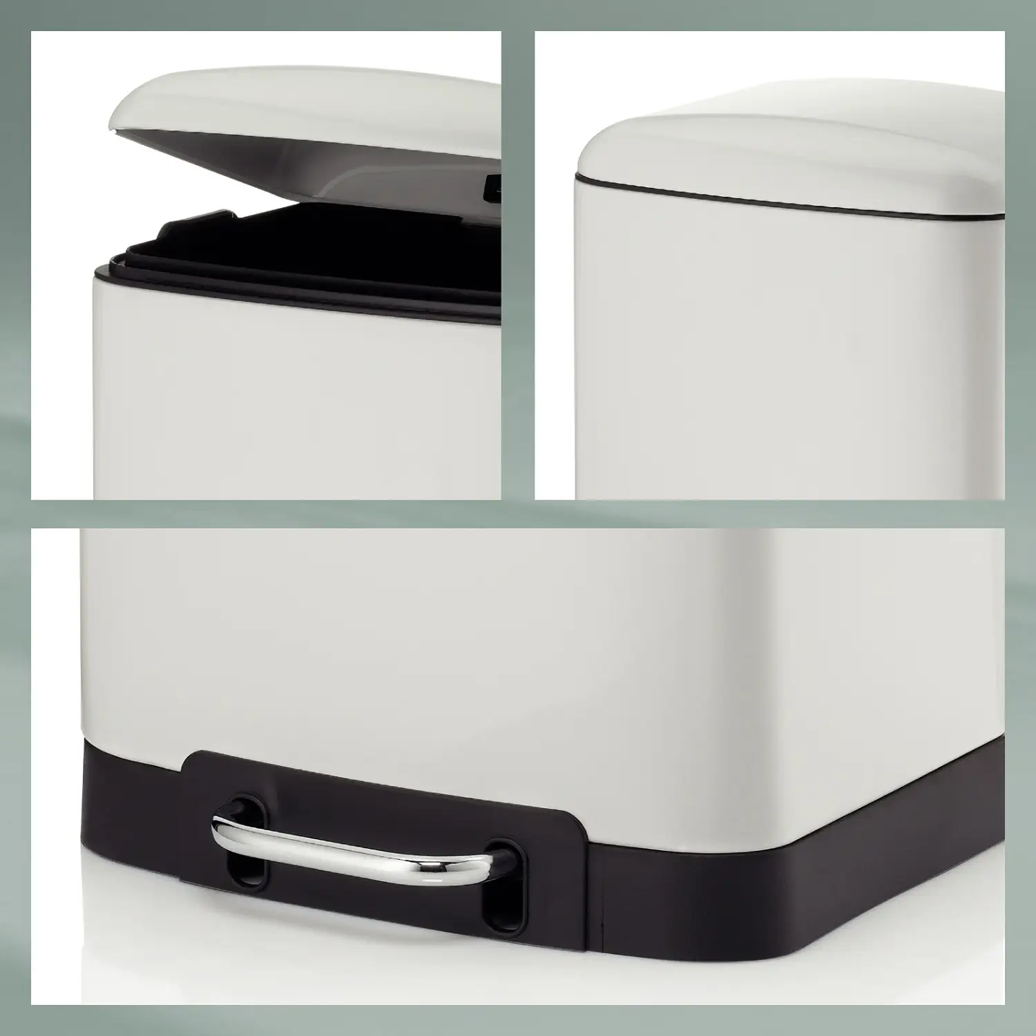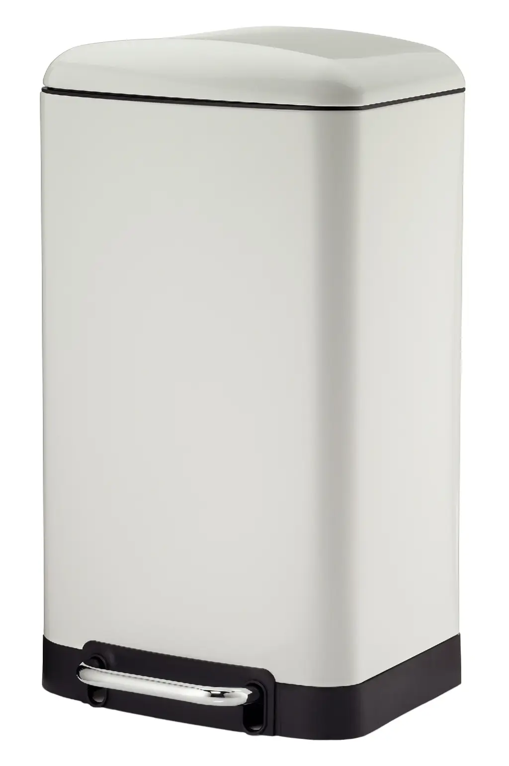 Prezentowany kosz o pojemności 30 L i wymiarach 34 x 30 x 61 cm (szer. x gł. x wys.) wykonano ze stali nierdzewnej. Ma on biały kolor z błyszczącym wykończeniem. Praktyczny pedał umożliwia higieniczne i wygodne korzystanie bez pomocy rąk. Technologia Silent Close sprawia, że pokrywa nie opada gwałtownie po zamknięciu, ale zamyka się cicho i powoli. Dodatkowo po lekkim naciśnięciu do tyłu, gdy jest otwarta, można ją zablokować, aby wygodnie wyjąć wewnętrzny pojemnik w celu bezproblemowego opróżnienia. By z powrotem odblokować pokrywę należy ponownie ją nacisnąć.