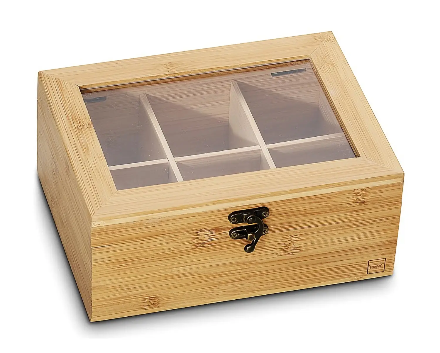 Prezentowany pojemnik Noa o wymiarach 21 x 16 x 9 cm (szer. x gł. x wys.) wykonano z bambusa w naturalnym kolorze i przezroczystego tworzywa sztucznego (akryl). Ma on neutralny wygląd, który odnajdzie się w różnych wnętrzach i przeznaczony jest do wygodnego przechowywania torebek herbaty - dzięki 6 komorom z łatwością oddzielić będzie można różne jej rodzaje. Okienko w pokrywie pozwala na podgląd zawartości bez konieczności otwierania. Pojemnik posiada zamknięcie na metalowy haczyk - łatwe i wygodne w używaniu. W razie potrzeby produkt należy czyścić ręcznie.