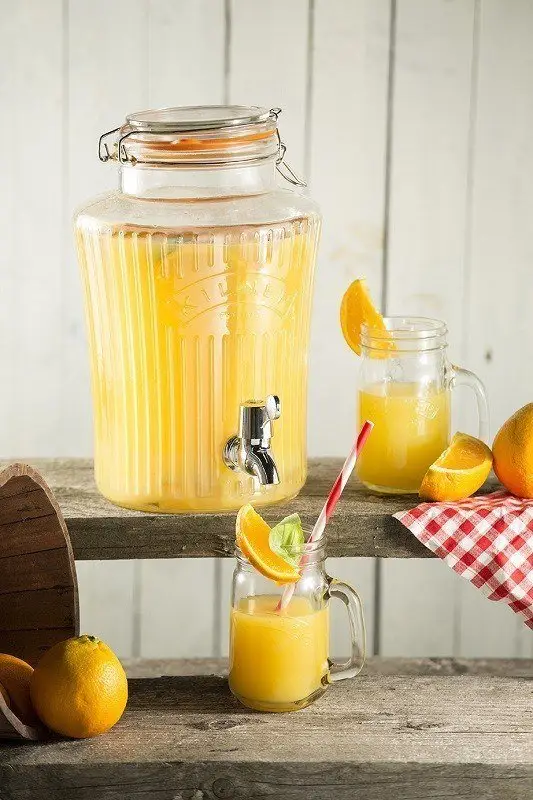 Szklany dystrybutor z praktycznym kranikiem sprawdzi się idealnie do serwowania lemoniady, kompotu czy innych napojów na rodzinnych spotkaniach. Solidna pokrywka z zamknięciem typu weck sprawia, że zamknięte w dystrybutorze napoje pozostaną świeże, dzięki temu możesz cieszyć się ich pysznym smakiem na dłużej. Szeroki otwór produktu ułatwia jego napełnianie oraz wkładanie dodatków jak np. kawałki owoców, zioła czy kostki lodu. Wyglądu retro nadaje żłobkowanie na ściankach oraz tłoczone logo marki widoczne z przodu.