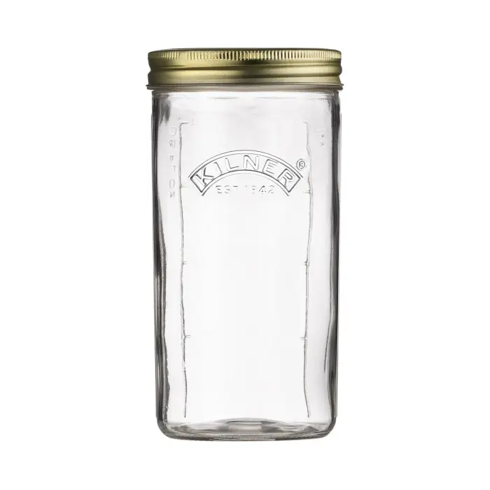 Słoik do przechowywania i konserwowania żywności o pojemności 1L wyposażony został w dwuczęściową nakrętkę, składającą się z cynowego krążka i śrubowej opaski, zapewniającą bezpieczne uszczelnienie próżniowe. Wykonano go z wysokiej jakości grubego szkła, odpornego na pęknięcia. Słoik z boku posiada wytłoczone wskaźniki objętości, przednia ściana ozdobiona została tłoczonym logo Kilner, a materiały z którego został wykonany są przyjazne dla środowiska. Słoik nadaje się do mycia w zmywarce, zakrętkę należy mycie ręczne.