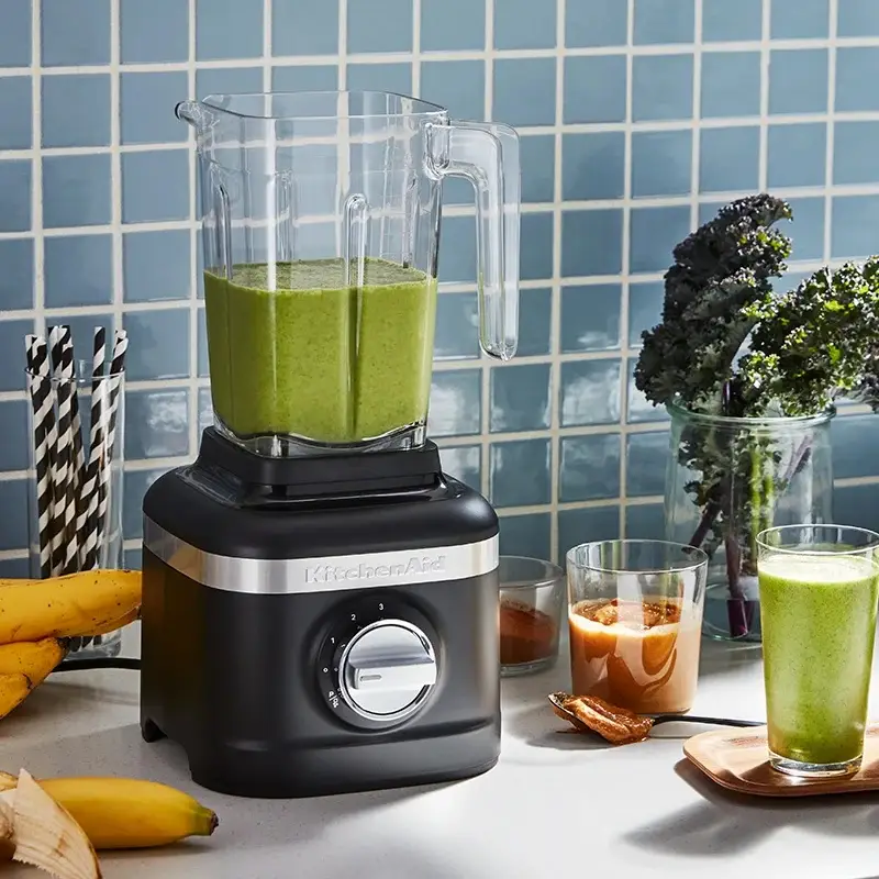 Blender K150 jest mniejszą wersją modelu K400. Korzysta on z rozwiązań zastosowanych także w innych blenderach KitchenAid. Praktyczna obudowa blendera w kolorze czarnym z matowym wykończeniem prezentuje się bardzo elegancko, dzięki czemu idealnie wpasuje się we wnętrze kuchni - tak nowoczesnej jak i bardziej tradycyjnej. Urządzenie posiada trzy prędkości i tryb pulsacyjny, który idealnie sprawdzi się np. do kruszenia lodu. Wszystkie jego tryby włączane są przez jedno pokrętło, co sprawia, że blender jest bardzo wygodny, intuicyjny w użytkowaniu. Silnik urządzenia - dzięki elektronicznemu systemowi kontroli prędkości Intelli-Speed® - dostosowuje energię do oporu zawartości blendera, co gwarantuje utrzymanie stałej prędkości podczas blendowania. Funkcja Soft-Start z kolei sprawia, że urządzenie zaczyna pracę powoli, następnie szybko zwiększa prędkość do wybranego trybu, zapobiegając niekontrolowanemu rozchlapywaniu zawartości. Innowacyjne czteroramienne ostrze ze stali nierdzewnej o grubości 3 mm posiada ramiona o różnych kątach nachylenia, co zapewnia wyjątkowo dokładne cięcie i rozdrabnianie składników.