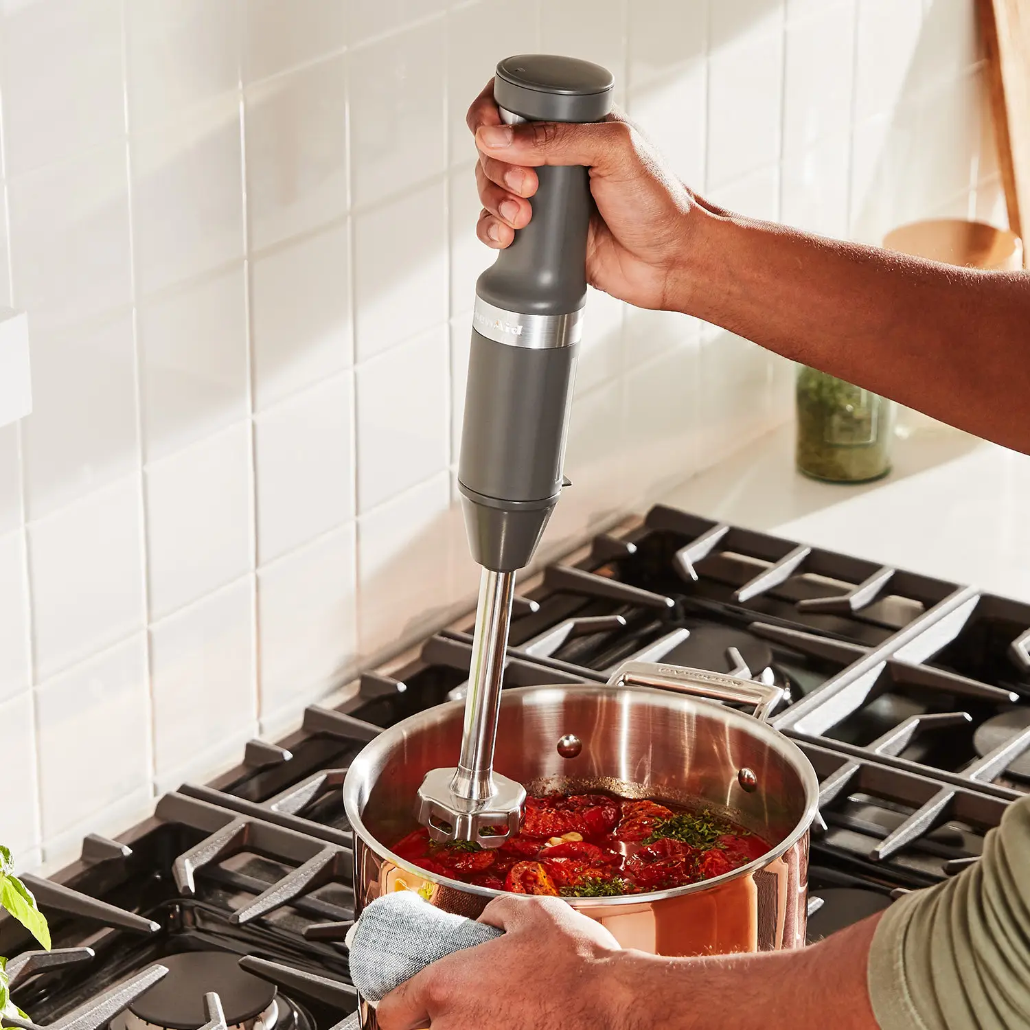 Bezprzewodowy blender ręczny 5KHBBV53 z kolekcji Cordless to urządzenie poręczne i praktyczne - można je obsługiwać jedną ręką, a dołączone w zestawie akcesoria (kielich 1 L, osłona) umożliwią łatwe przechowanie składników i blendera, a osłona dodatkowo ochroni naczynia przed uszkodzeniami, co niewątpliwie ułatwi pracę w kuchni. Jego prosty design i antracytowy kolor sprawiają, że blender prezentuje się niezwykle elegancko, doskonale nadając się do nowoczesnej kuchni.