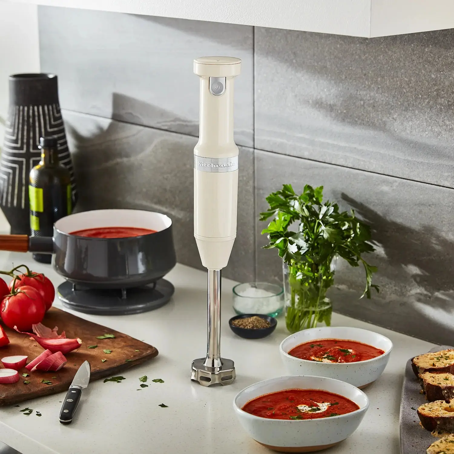 Bezprzewodowy blender ręczny 5KHBBV53 z kolekcji Cordless to urządzenie poręczne i praktyczne - można je obsługiwać jedną ręką, a dołączone w zestawie akcesoria (kielich 1 L, osłona) umożliwią łatwe przechowanie składników i blendera, a osłona dodatkowo ochroni naczynia przed uszkodzeniami, co niewątpliwie ułatwi pracę w kuchni. Jego prosty design i kremowy kolor sprawiają, że blender prezentuje się niezwykle elegancko, doskonale nadając się do nowoczesnej kuchni.