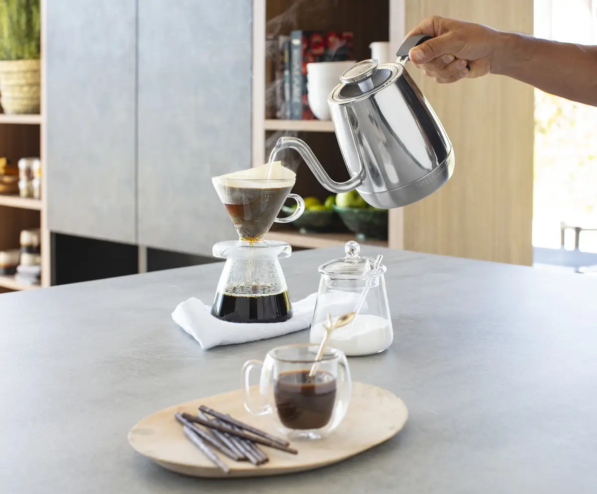 Każdy rodzaj herbaty posiada swoją optymalną temperaturę parzenia. Dzięki czajnikowi z cyfrową regulacją temperatury nie doprowadzisz pospiesznie wody do wrzenia lecz starannie dostosujesz ją dla twojego gatunku herbaty. Czajnik podgrzewa wodę stopniowo i starannie, a temperaturę można ustawić z przyrostem co 1 stopień od 60 do 100°C. Posiada również funkcję utrzymania ciepła przez 30 minut. Do wyboru są 3 poziomy stałego przepływu wody. Niski przepływ jest przeznaczony do parzenia kawy metodą pour-over, średni przepływ jest doskonały do herbaty a szybki przepływ jest najlepszy do zalewania kawy wodą w ekspresie french press.