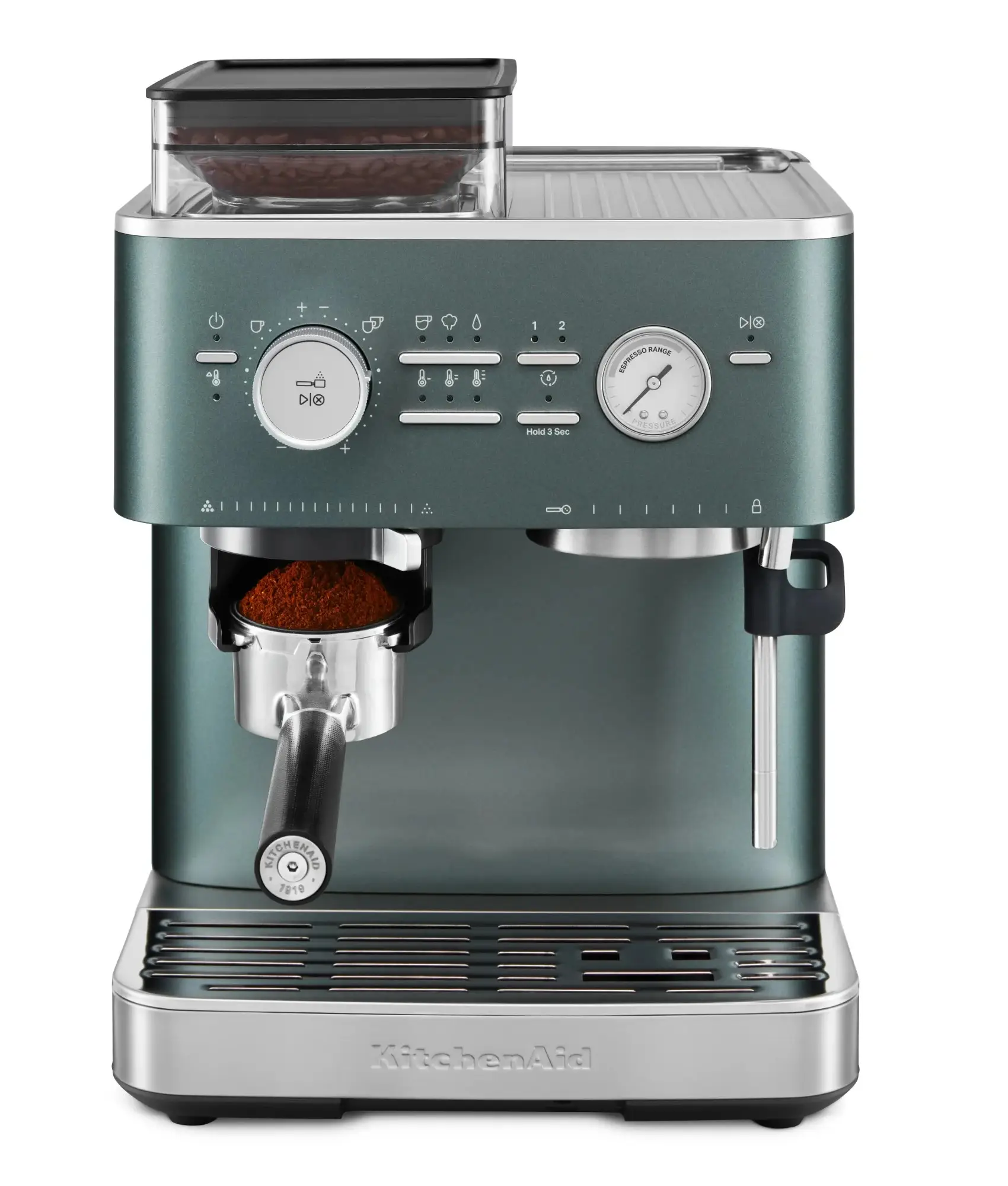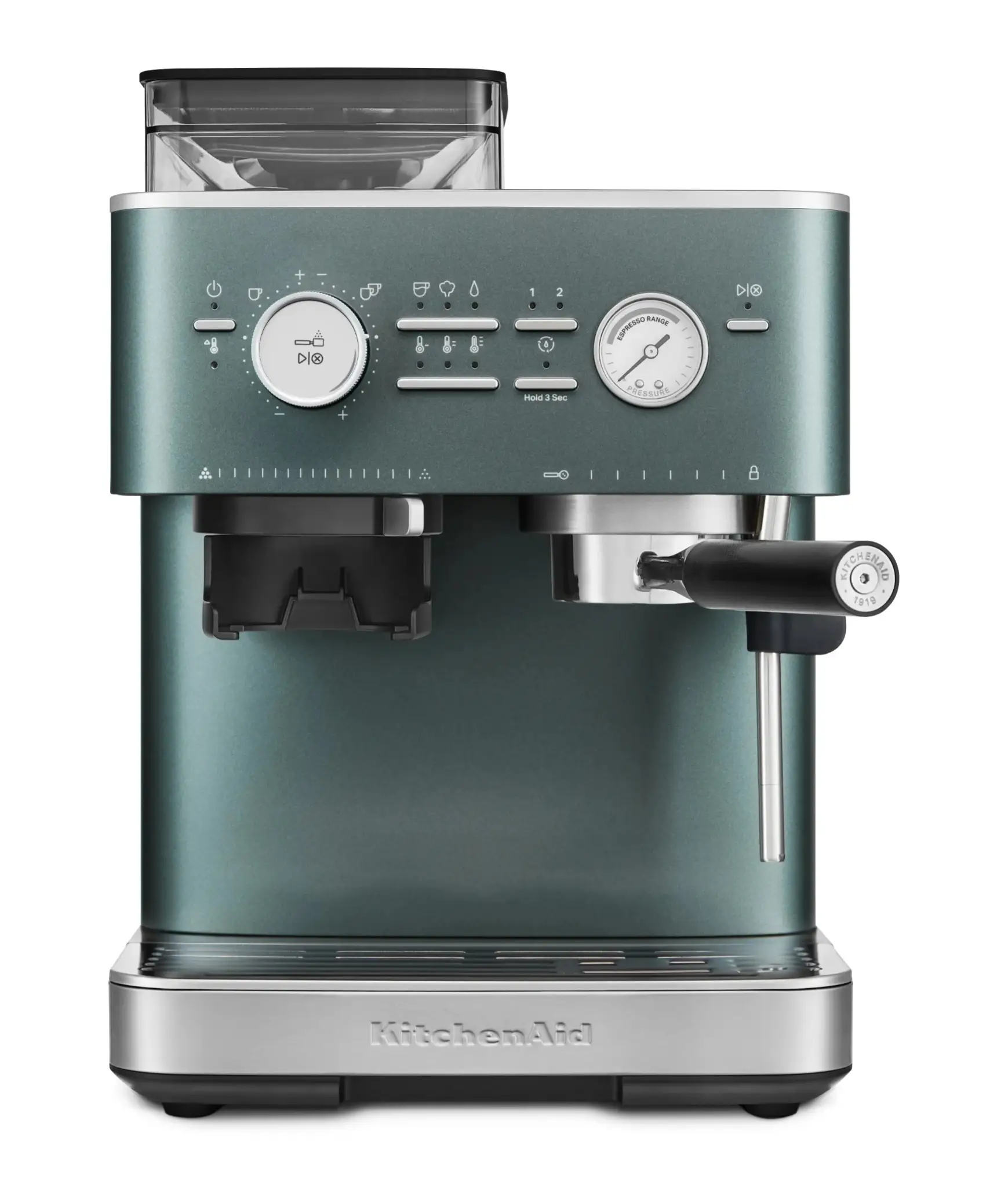 Prezentowany ekspres w kolorze Juniper z półmatowym wykończeniem ma w pełni metalową obudowę, co przekłada się na odpowiednią solidność i trwałość. Wyposażono go w precyzyjny, zintegrowany młynek z żarnami ze stali nierdzewnej i 15 stopniami grubości przemiału, który w połączeniu z inteligentnym systemem dozowania zapewnia niespotykaną powtarzalność w przygotowywaniu idealnego espresso, a przy tym pozwala na manualne dostosowanie ilości zmielonej kawy pod własne preferencje. Wyjmowany pojemnik na ziarna kawy ze szczelną pokrywą nie tylko zapewnia świeżość ziaren, ale i umożliwia wygodne zmienianie rodzaju parzonej kawy oraz ułatwia czyszczenie ekspresu. Również pojemnik na wodę o pojemności 2,5 L (wystarczy do przygotowania ponad 30 espresso bez konieczności ponownego napełniania) jest wyjmowany dla codziennego komfortu używania. Ekspres posiada także praktyczny uchwyt na kolbę, który ułatwia mielenie ziaren bezpośrednio do kolby oraz kółka ukryte w podstawie dla swobodnego przemieszczania po blacie.