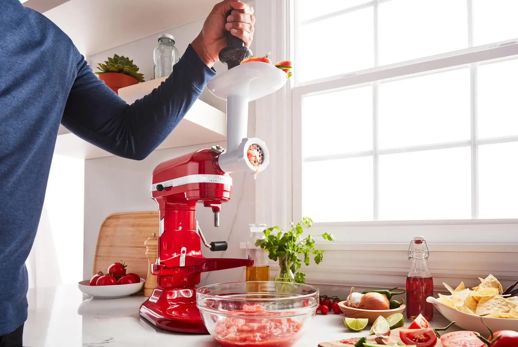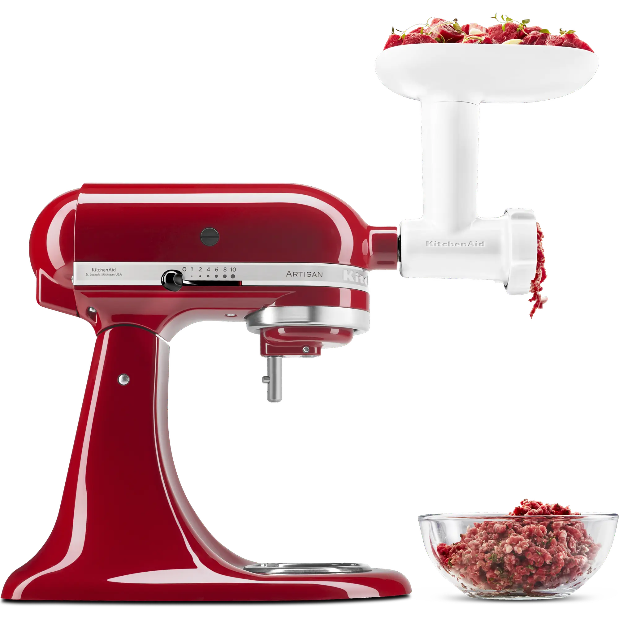 Popularna przystawka do mielenia mięsa KitchenAid w nowej odsłonie jest teraz znacznie wytrzymalsza i łatwiejsza w obsłudze. Pasująca do wszystkich mikserów stojących maszynka umożliwia szybkie mielenie, siekanie i rozdrabnianie różnego rodzaju składników przy pomocy siły miksera. Przystawka doskonale nadaje się również do rozdrabniania, warzyw, owoców, orzechów i sera.