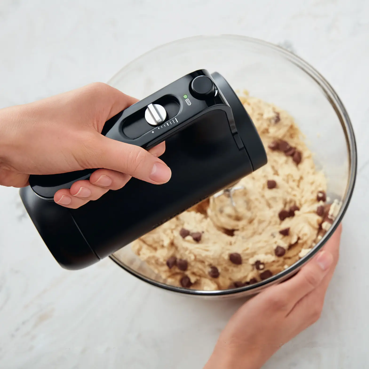 Mikser posiada akumulator litowo-jonowy, który jest bardzo wydajny i zapewnia optymalny czas działania - w pełni naładowany pozwoli na zrobienie ciasta na 200 ciasteczek. O konieczności jego naładowania poinformuje wskaźnik baterii. Samo ładowanie zajmie jedynie do 2 godzin - do miksera dołączona została ładowarka, która pasuje również do innych urządzeń z kolekcji Cordless. Urządzenie posiada 2 trzepaczki ze stali nierdzewnej o wzmocnionej u nasady konstrukcji są szybkie w demontażu - za pomocą dużego przycisku, oraz nadają się do mycia w zmywarce, co ułatwi ich czyszczenie. Mikser został zaprojektowany tak, by można go było postawić na blacie, co dodatkowo wpłynie na wygodę korzystania z niego. Posiada 7 regulowanych przy pomocy suwaka prędkości, które pozwolą na powolne mieszanie składników, szybsze połączenie np. cukru z masłem, a także na szybkie ubijanie jajek, kremów czy śmietany. Jego zaletą jest także funkcja Soft Start, która wyeliminuje gwałtowne rozpryskiwanie składników powoli zwiększając prędkość po uruchomieniu urządzenia.