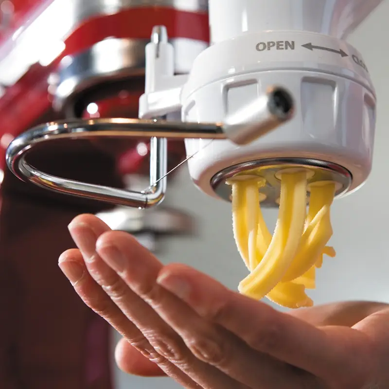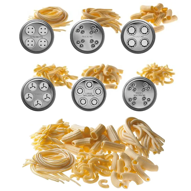 Przystawka służy do wyrobu okrągłych, wyciskanych makaronów, nie wymagających wałkowania.
