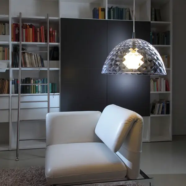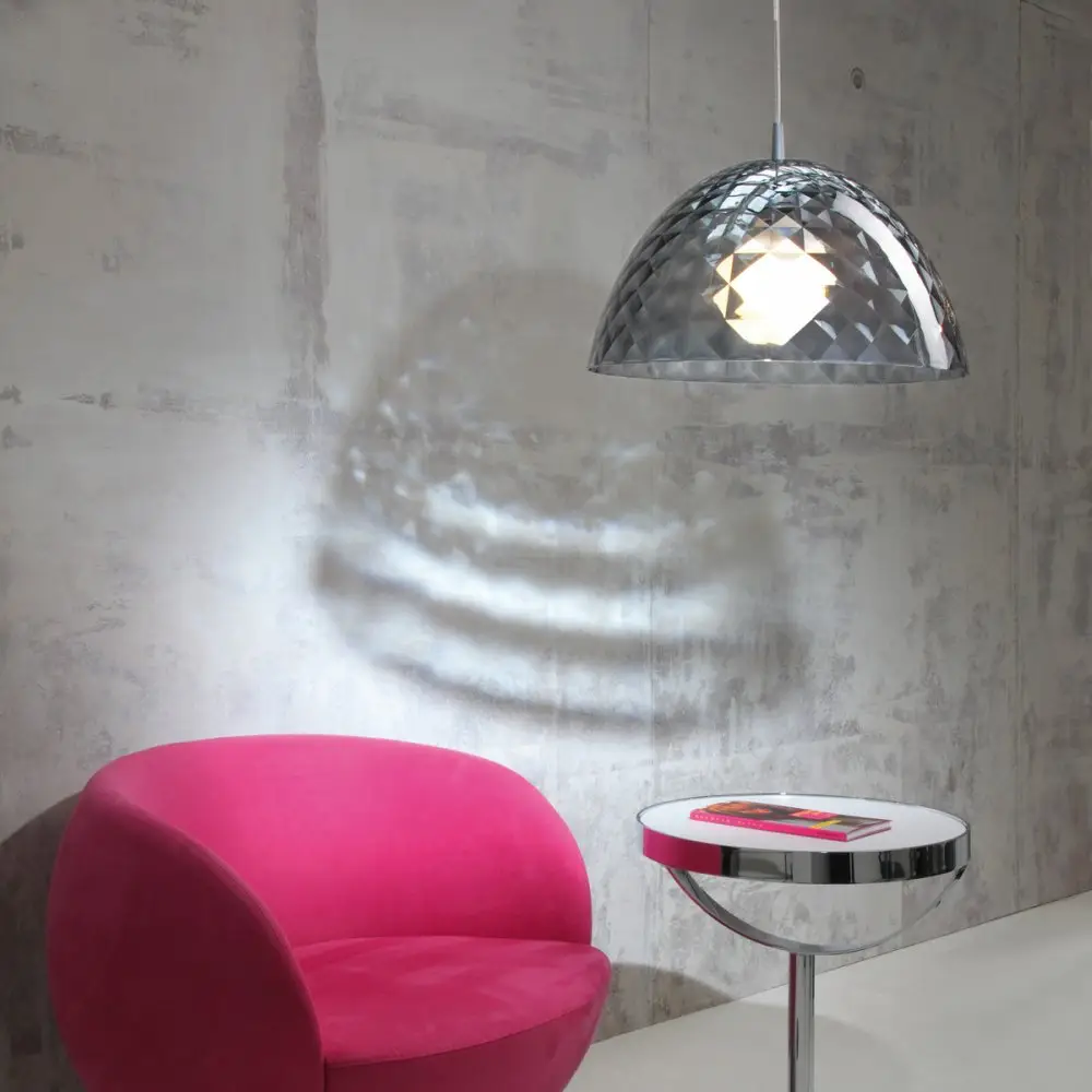 Prawdziwy klejnot wśród lamp jest połączeniem prostego kształtu z niezwykłym, diamentowym wykończeniem. Lampa Stella chociaż została wykonana z tworzywa sztucznego, wygląda jak kryształowa misa, której fragmenty załamujące światło prezentują się niczym drogocenna biżuteria. Świecąca wewnątrz żarówka wygląda niesamowicie, dzięki rozproszeniu światła przez oryginalną, diamentową strukturę powierzchni. Lekka, sporej wielkości lampa wprowadzi kolor i kryształowy blask do każdego nowoczesnego wnętrza.