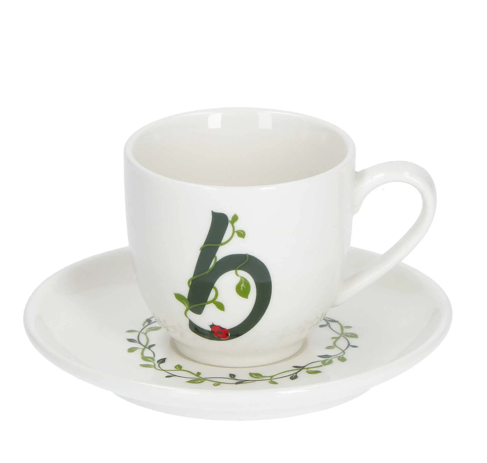 Filiżanki do kawy i herbaty zdobione zielonymi literami alfabetu i roślinnym motywem ożywią każdy, nawet najprostszy serwis obiadowy! W zestawie z filiżanką otrzymasz także talerzyk z motywem liści bluszczu, który dopełni Twoją kolekcję!