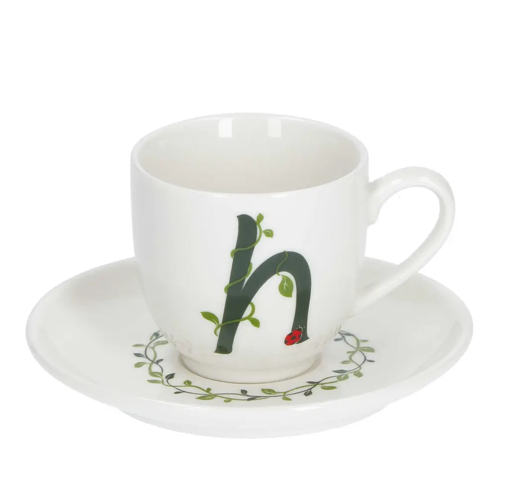 Filiżanki do kawy i herbaty zdobione zielonymi literami alfabetu i roślinnym motywem ożywią każdy, nawet najprostszy serwis obiadowy! W zestawie z filiżanką otrzymasz także talerzyk z motywem liści bluszczu, który dopełni Twoją kolekcję!