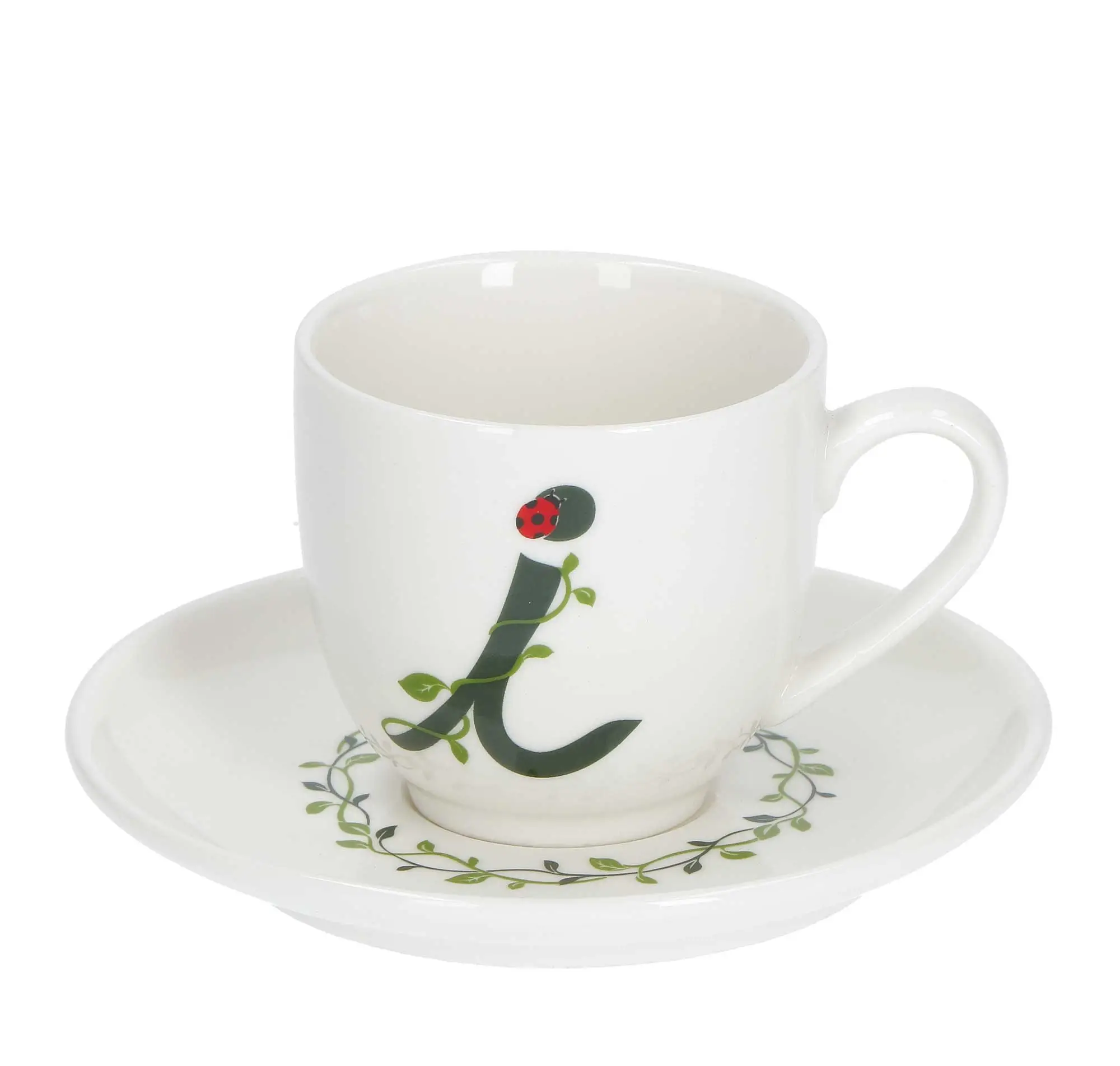 Filiżanki do kawy i herbaty zdobione zielonymi literami alfabetu i roślinnym motywem ożywią każdy, nawet najprostszy serwis obiadowy! W zestawie z filiżanką otrzymasz także talerzyk z motywem liści bluszczu, który dopełni Twoją kolekcję!