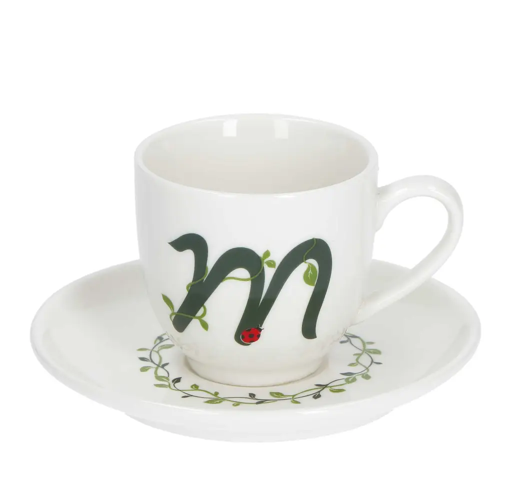 Filiżanki do kawy i herbaty zdobione zielonymi literami alfabetu i roślinnym motywem ożywią każdy, nawet najprostszy serwis obiadowy! W zestawie z filiżanką otrzymasz także talerzyk z motywem liści bluszczu, który dopełni Twoją kolekcję!