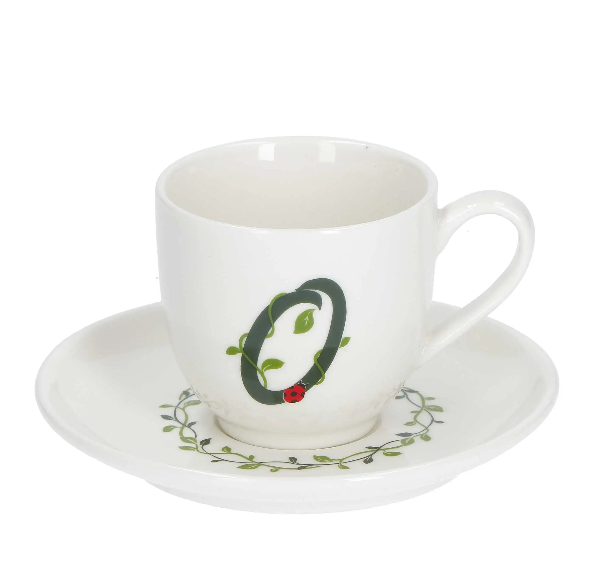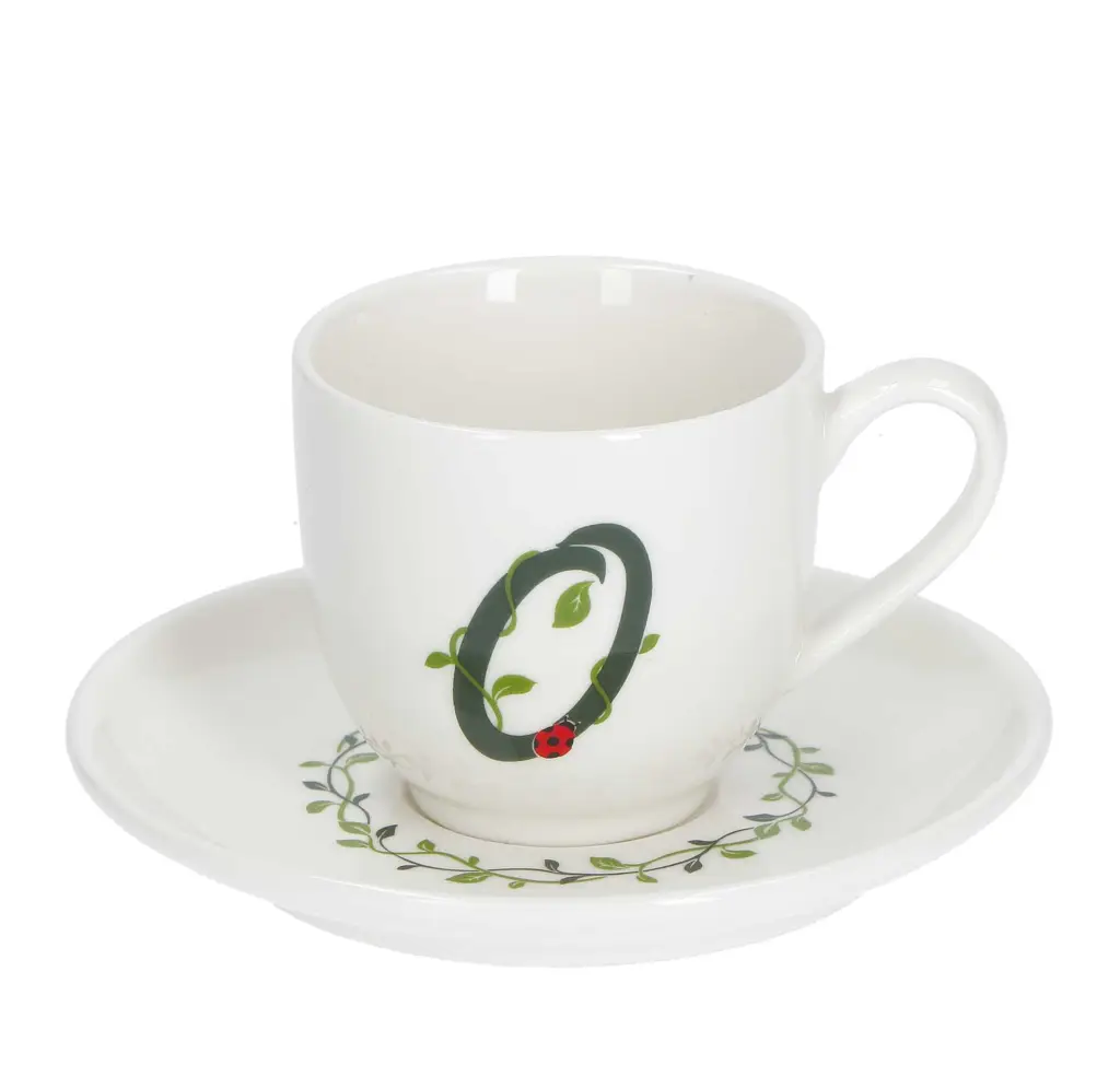 Filiżanki do kawy i herbaty zdobione zielonymi literami alfabetu i roślinnym motywem ożywią każdy, nawet najprostszy serwis obiadowy! W zestawie z filiżanką otrzymasz także talerzyk z motywem liści bluszczu, który dopełni Twoją kolekcję!