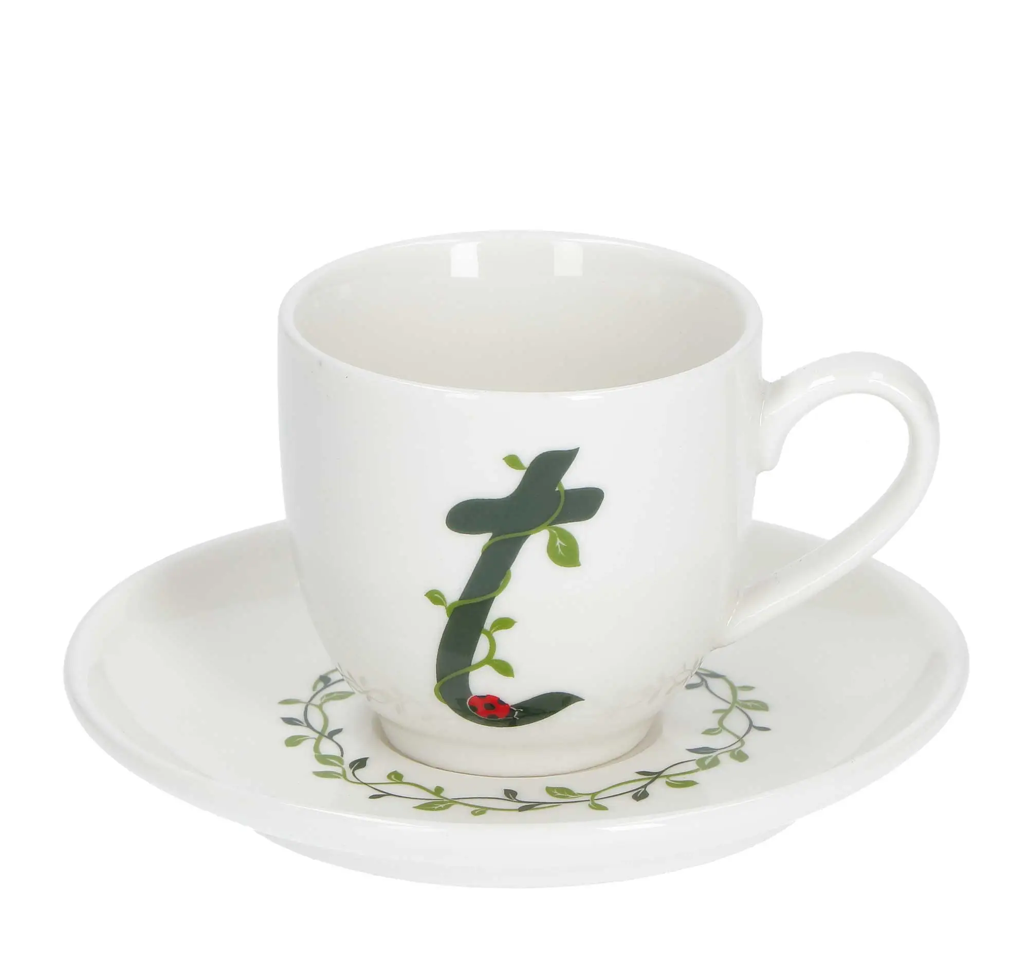 Filiżanki do kawy i herbaty zdobione zielonymi literami alfabetu i roślinnym motywem ożywią każdy, nawet najprostszy serwis obiadowy! W zestawie z filiżanką otrzymasz także talerzyk z motywem liści bluszczu, który dopełni Twoją kolekcję!