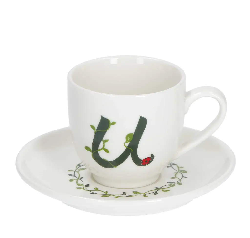 Filiżanki do kawy i herbaty zdobione zielonymi literami alfabetu i roślinnym motywem ożywią każdy, nawet najprostszy serwis obiadowy! W zestawie z filiżanką otrzymasz także talerzyk z motywem liści bluszczu, który dopełni Twoją kolekcję!
