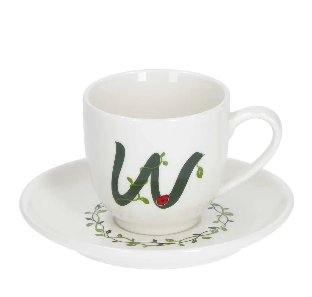 Filiżanki do kawy i herbaty zdobione zielonymi literami alfabetu i roślinnym motywem ożywią każdy, nawet najprostszy serwis obiadowy! W zestawie z filiżanką otrzymasz także talerzyk z motywem liści bluszczu, który dopełni Twoją kolekcję!