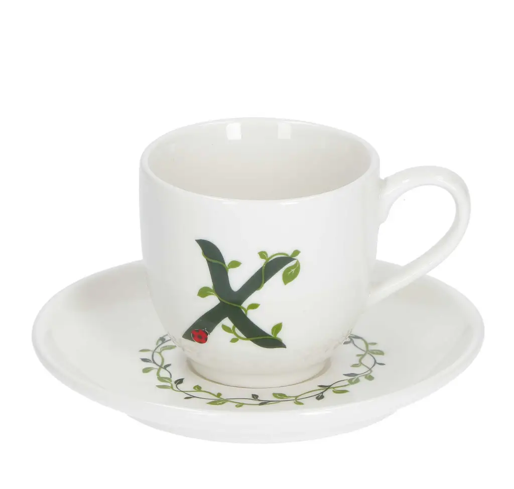 Filiżanki do kawy i herbaty zdobione zielonymi literami alfabetu i roślinnym motywem ożywią każdy, nawet najprostszy serwis obiadowy! W zestawie z filiżanką otrzymasz także talerzyk z motywem liści bluszczu, który dopełni Twoją kolekcję!