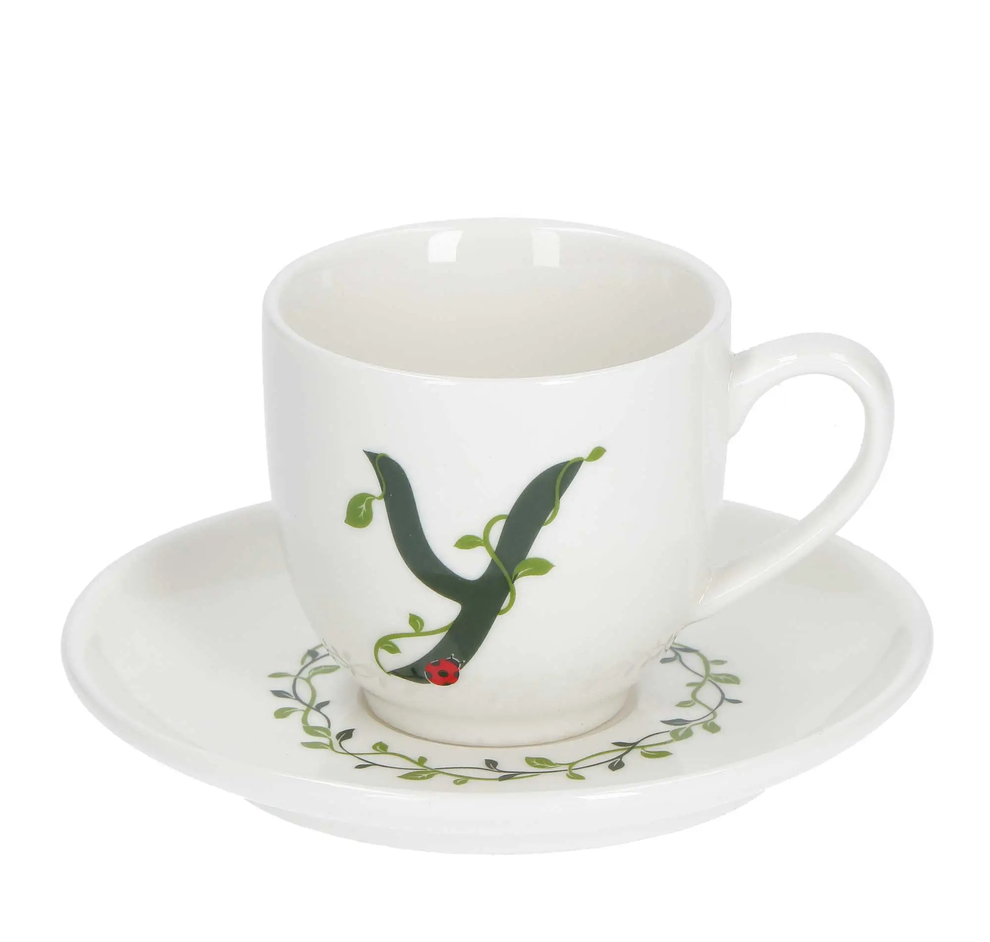 Filiżanki do kawy i herbaty zdobione zielonymi literami alfabetu i roślinnym motywem ożywią każdy, nawet najprostszy serwis obiadowy! W zestawie z filiżanką otrzymasz także talerzyk z motywem liści bluszczu, który dopełni Twoją kolekcję!