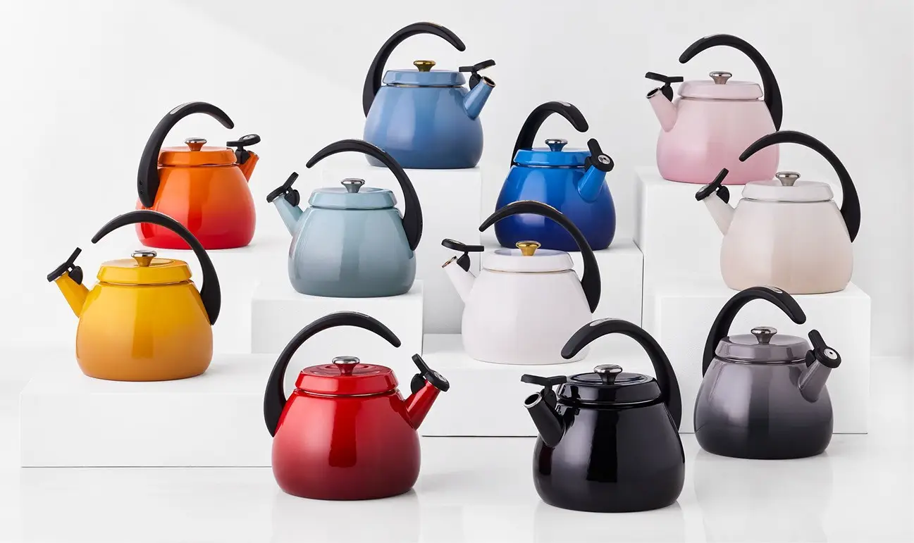 Czajnik Le Creuset o pojemności 2,1 l łączy elegancki design z wysoką funkcjonalnością, stając się stylowym elementem każdej kuchni. Żywe kolory w połączeniu z markową gałką ze szczotkowanej stali nierdzewnej, dostępną w wersji srebrnej lub złotej, nadają mu wyjątkowy charakter. Szeroka podstawa zapewnia szybkie i równomierne ogrzewanie, co skraca czas gotowania wody, a stały uchwyt pozostaje chłodny w dotyku, gwarantując wygodne i bezpieczne nalewanie. Solidne wykonanie oraz dbałość o detale sprawiają, że czajnik ten jest nie tylko praktycznym narzędziem, ale także dekoracyjnym akcentem, który posłuży przez lata.