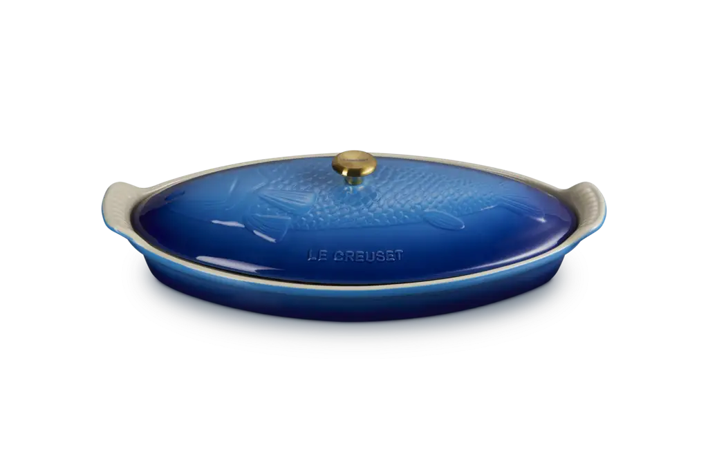 Eleganckie naczynie marki Le Creuset wyróżnia się dekoracyjnym motywem rybnym oraz stylowym złotym uchwytem, które razem tworzą wyjątkową oprawę do serwowania potraw. Zostało zaprojektowane z myślą o przygotowywaniu ryb, ale doskonale sprawdzi się również do pieczenia i gotowania na parze warzyw, mięs oraz dań jednogarnkowych. Starannie wyprofilowane krawędzie wspierają równomierne rozprowadzanie ciepła, co przekłada się na lepszą jakość potraw, natomiast dopasowana pokrywa pomaga zachować wilgoć i pełnię smaku podczas gotowania.
