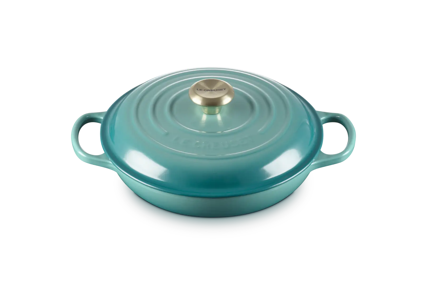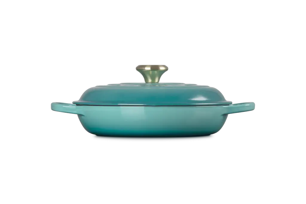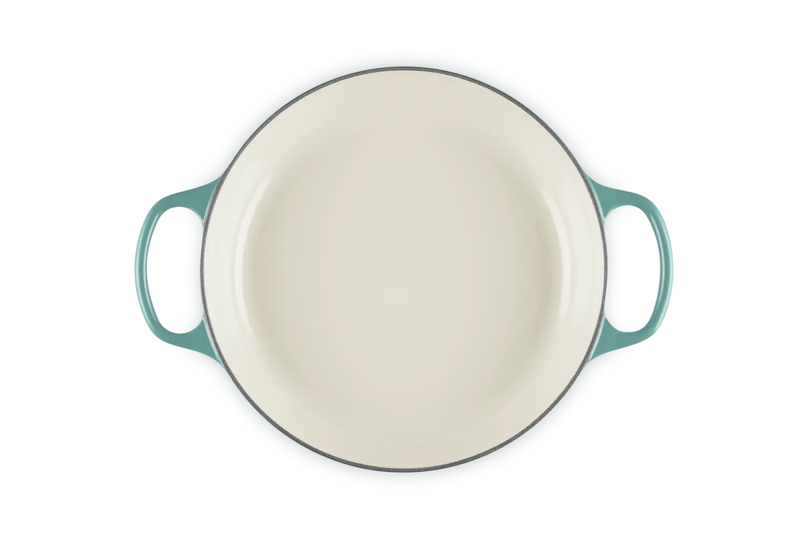 Żeliwny garnek marki Le Creuset wykonany został we Francuskiej odlewni. Płytka brytfanna jest niesamowicie wszechstronna. Ma duże dno oraz niskie boki. Dwa wygodne uchwyty ułatwiają przenoszenie i serwowanie dań. Profesjonalne naczynie idealnie nadaje się do smażenia i pieczenia mięs, warzyw zapiekanek oraz dań typu stir fry. Brytfanna poprawia proces karmelizacji, dzięki czemu przygotowane potrawy mają jeszcze lepszy smak. Naczynie o średnic 26 cm ma 2,2 litra pojemności.