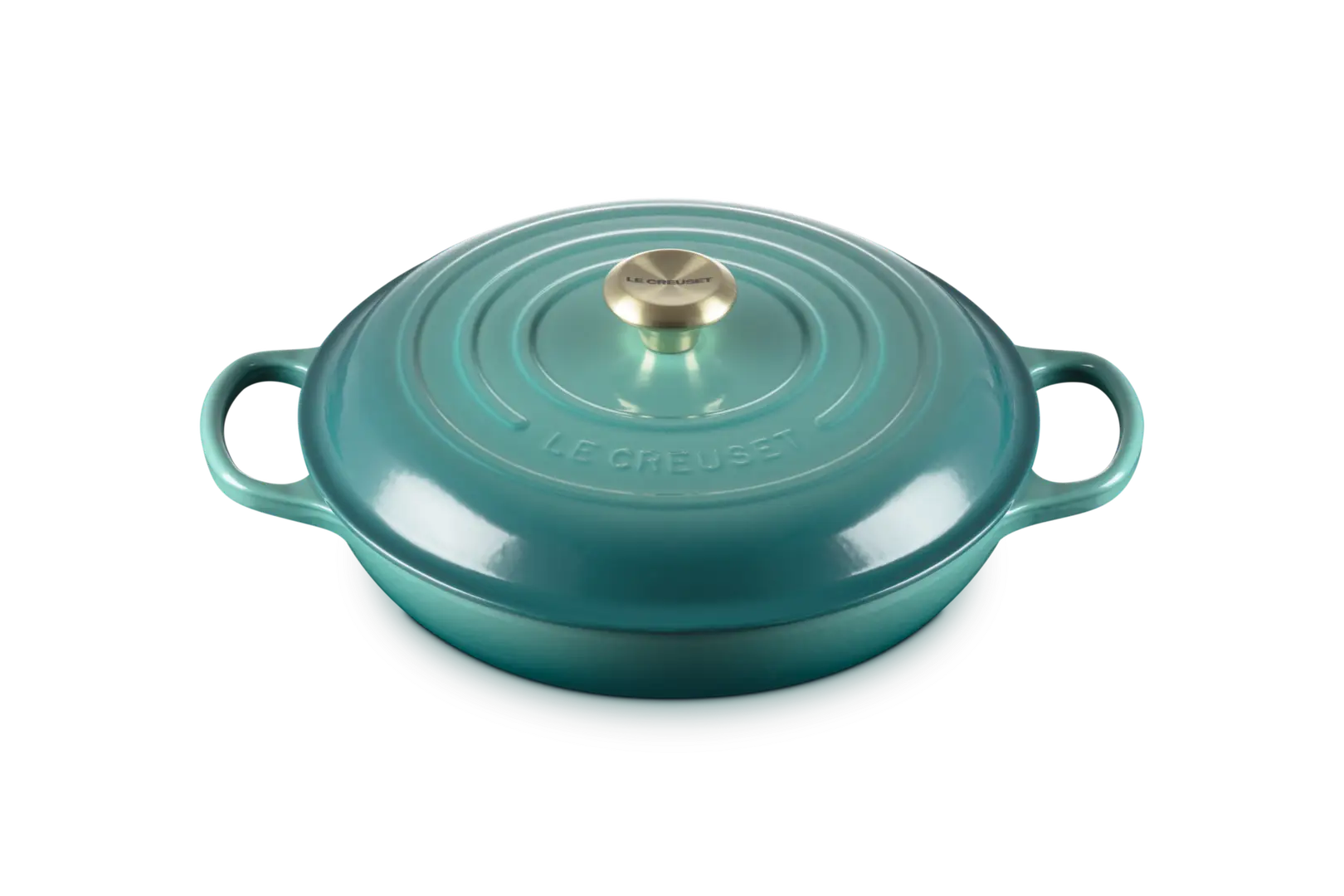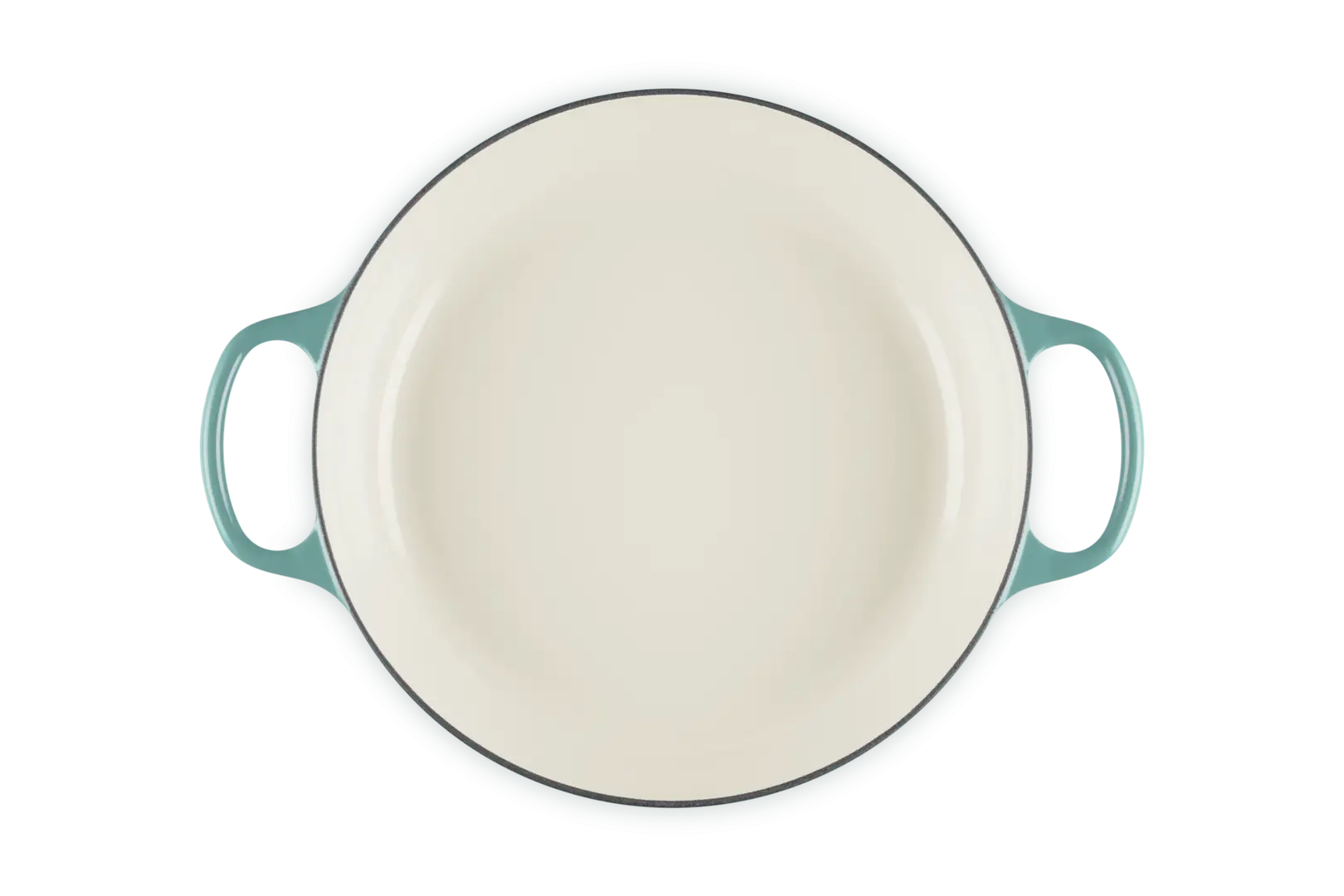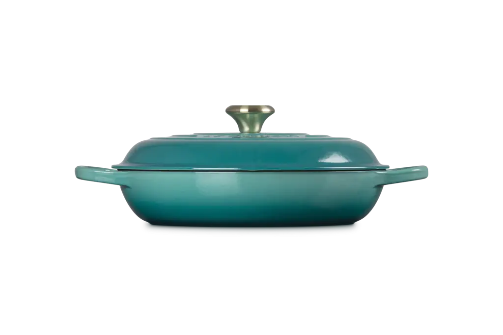 Wykonany we Francuskiej odlewni garnek gourmet marki Le Creuset ma 30 cm średnicy i 3,5 litra pojemności. Brytfanna posiada płaskie dno i niskie boki. Taka konstrukcja sprawia, że można jej użyć jako patelni, formy do zapiekanek, ciast lub chlebów. W zestawie znajduje się pokrywa. Naczynie wykonane jest z żeliwa pokrytego emalią. Piękne kolory brytfanny przyciągają wzrok i dodadzą charakteru Twojej kuchni.