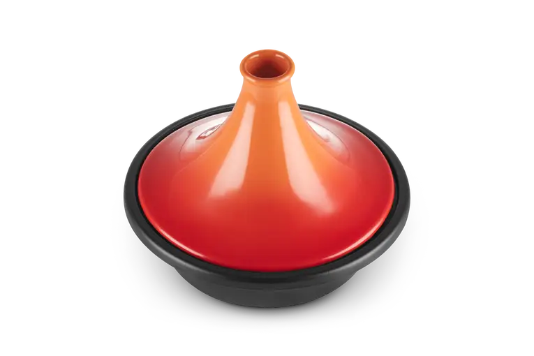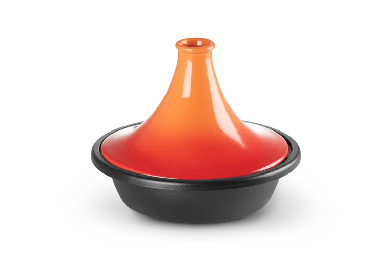 Wykonane z żeliwa tagine inspirowane jest marokańską kuchnią. Przygotujesz w nim tradycyjne marokańskie dania, a także do wolnego gotowania mięsa lub warzyw z odrobiną płynu. Żeliwna podstawa gwarantuje równomierne rozprowadzanie się ciepła, a kamionkowa pokrywa zatrzymuje para. Skrapla się ona i spływa na składniki, nadając przygotowanym potrawą smaku i wilgotności.