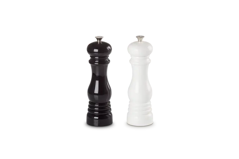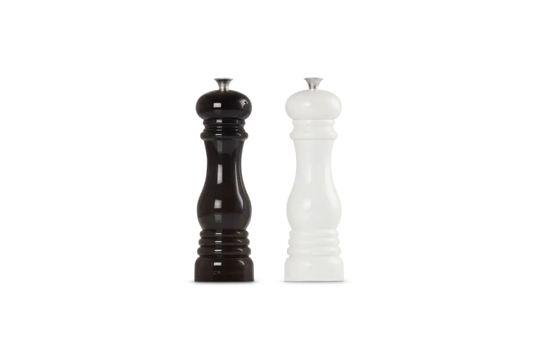 Zestaw dwóch młynków do soli i pieprzu marki Le Creuset. Ich design świetnie wygląda w każdym pomieszczeniu. Wytrzymały mechanizm ceramiczny z łatwością zmieli ziarenka pieprzu i kryształki soli w drobne przyprawy. Młynek posiada regulację grubości mielenia.