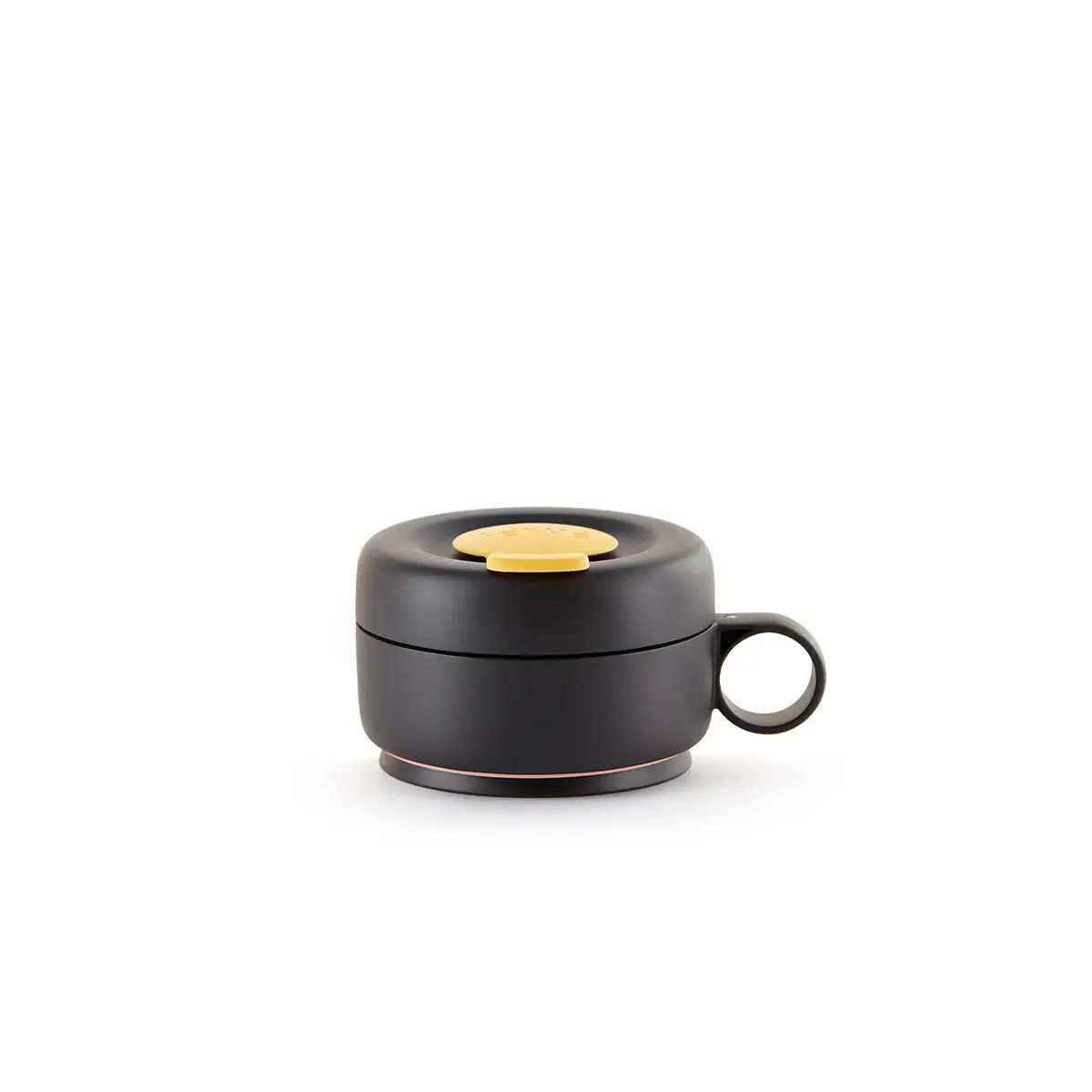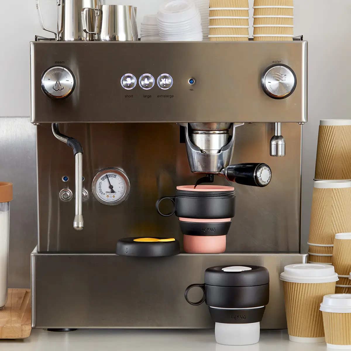 Ekologiczny i praktyczny kubek marki Lekue pochodzi z kolekcji TO GO. która stworzona została z myślą o osobach zabieganych. Złożony ma kształt krążka, dzięki czemu zmieści się w każdej torebce lub plecaku. Kubek posiada rączkę oraz silikonową opaskę, która chroni dłonie gdy napój jest bardzo ciepły. Kubek można myć w zmywarce do naczyń i podgrzewać w kuchence mikrofalowej (max. czas podgrzewania do 1 min). Możliwa regulacja pozycji kapsla, pozwalająca na wygodne picie. Produkt wolny od BPA.