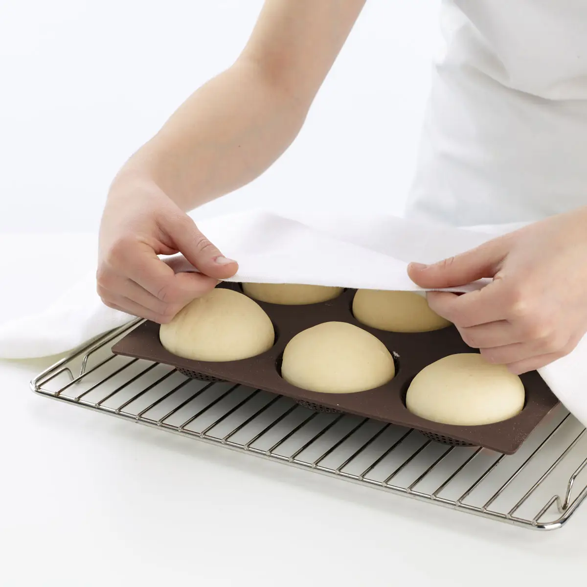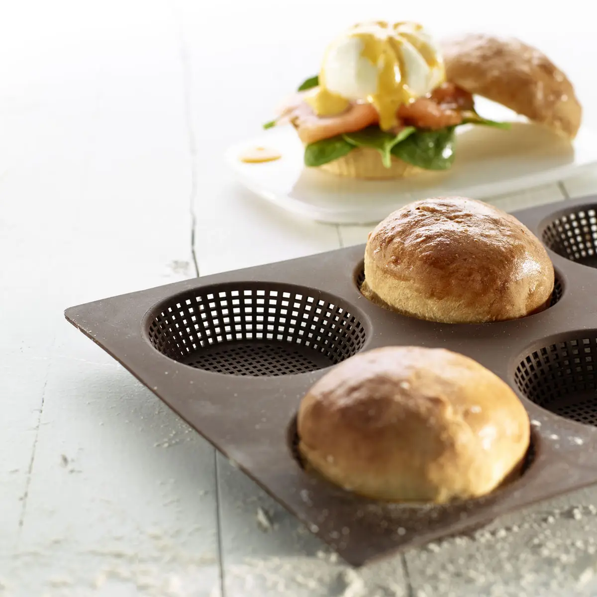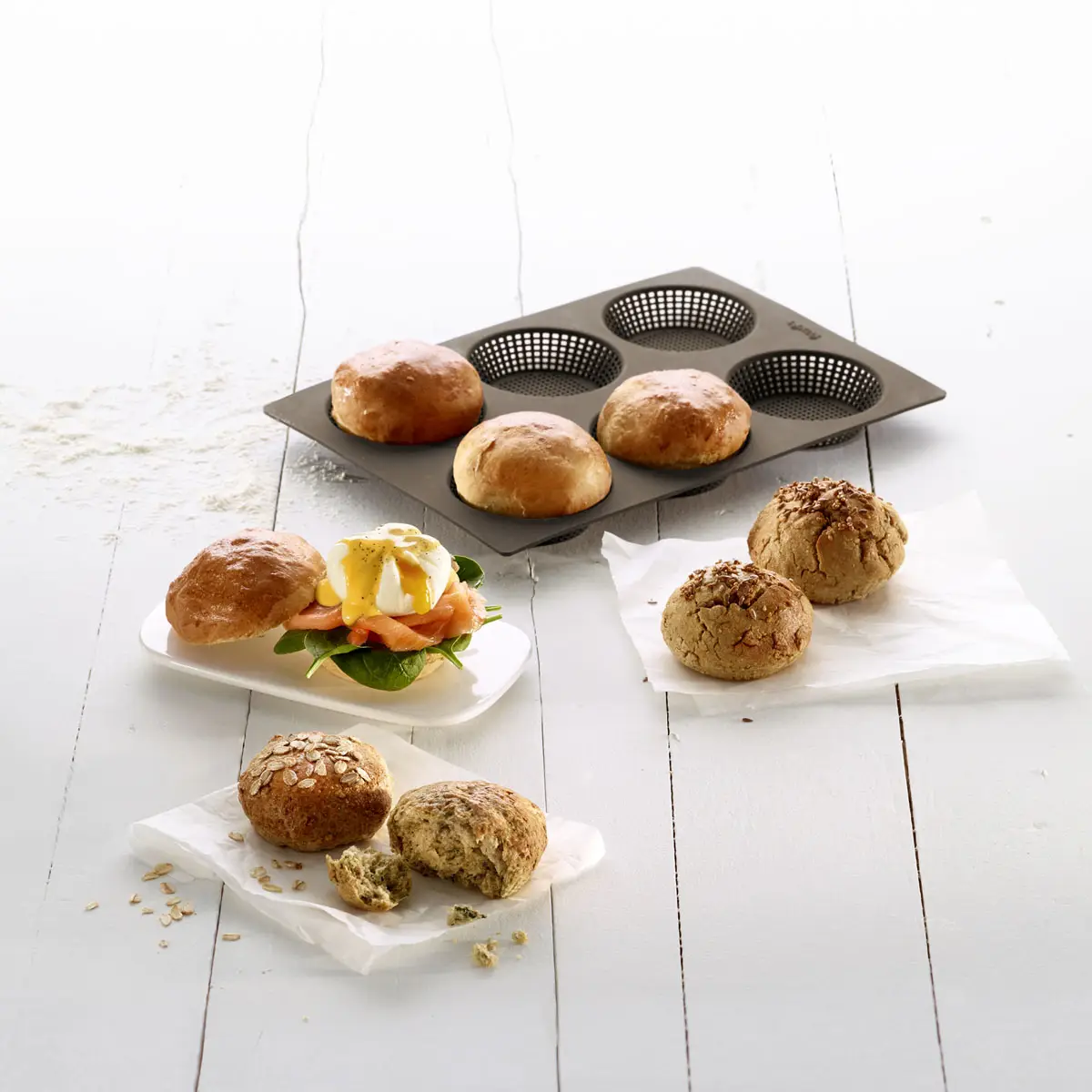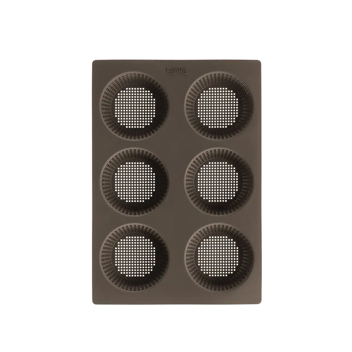 Forma marki Lekue pozwala na upieczenie 6 bułek o idealnym kształcie. Wykonana została z wysokiej jakości silkonu platinium. Posiada nieprzywierającą powłokę, dzięki czemu do pieczenia nie trzeba używać tłuszczu, a wypieki łatwo się wyciąga. Dno formy jest perforowane, co zapewnia idealną cyrkulację powietrza, dzięki temu skórka bułek zawsze wychodzi chrupiąca. Perforacja pozwala także, na szybkie studzenie pieczywa.