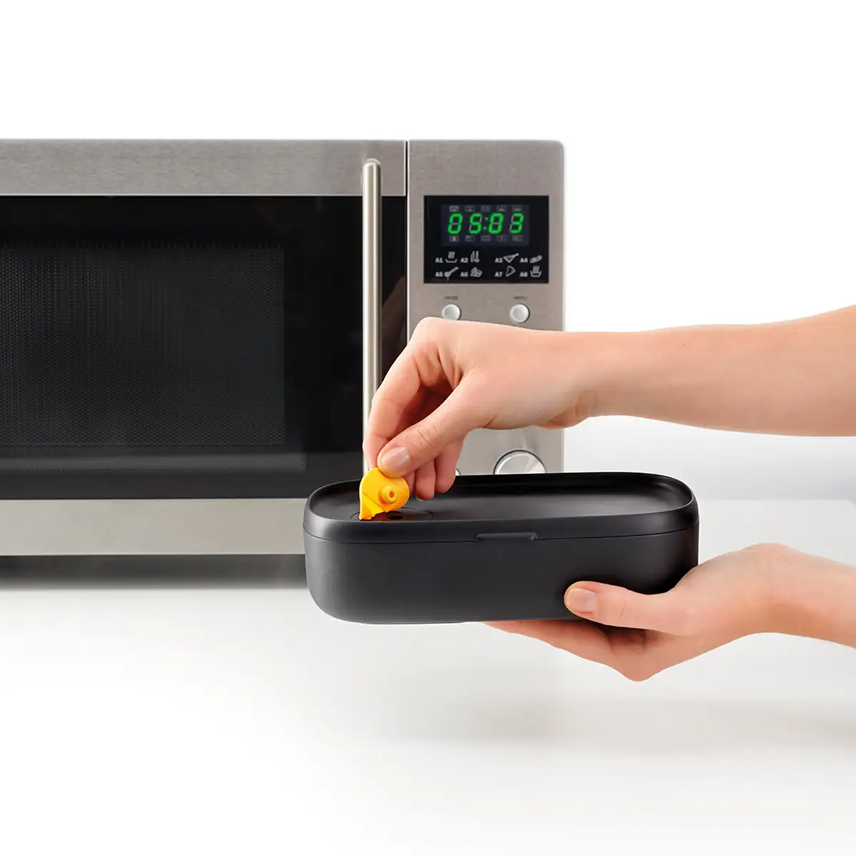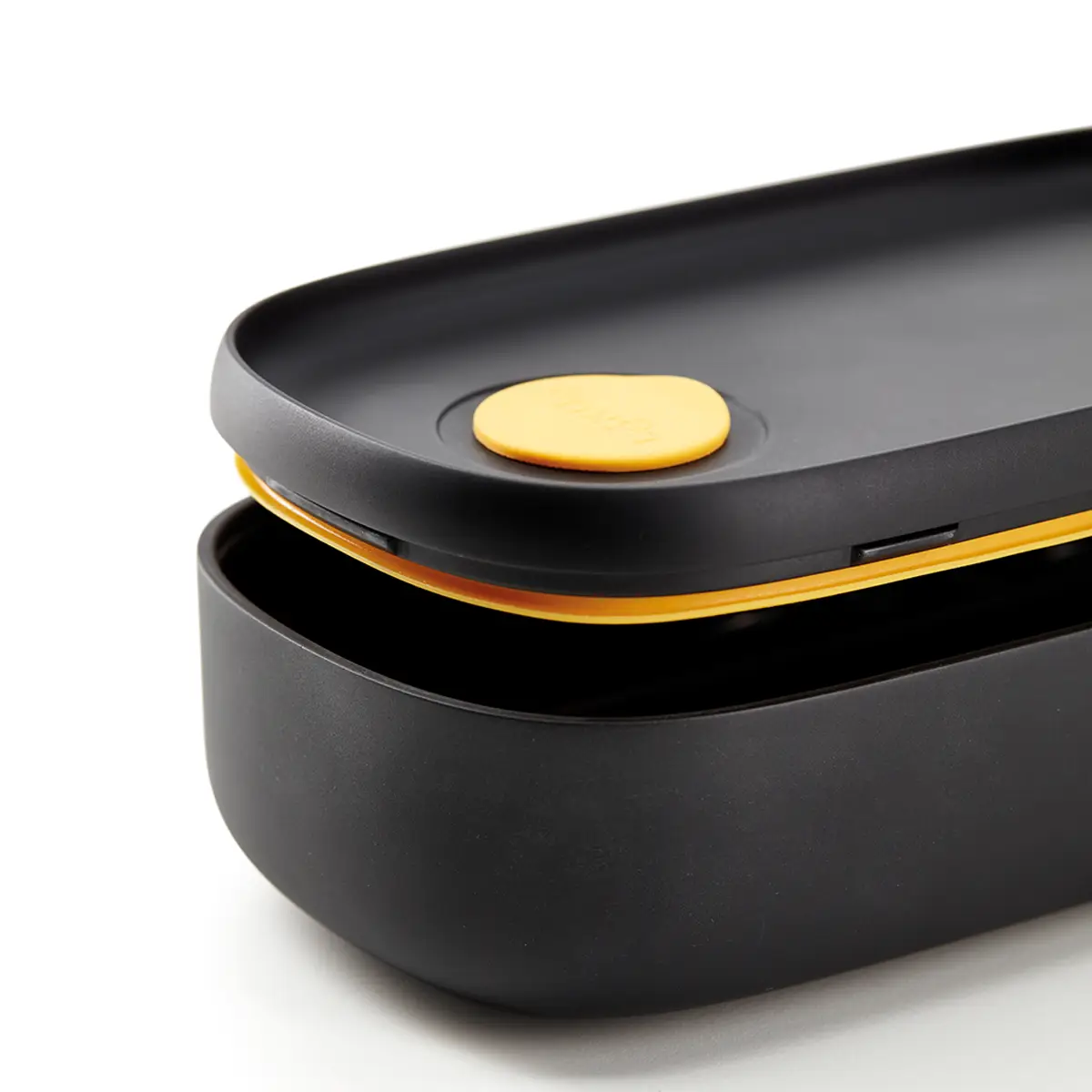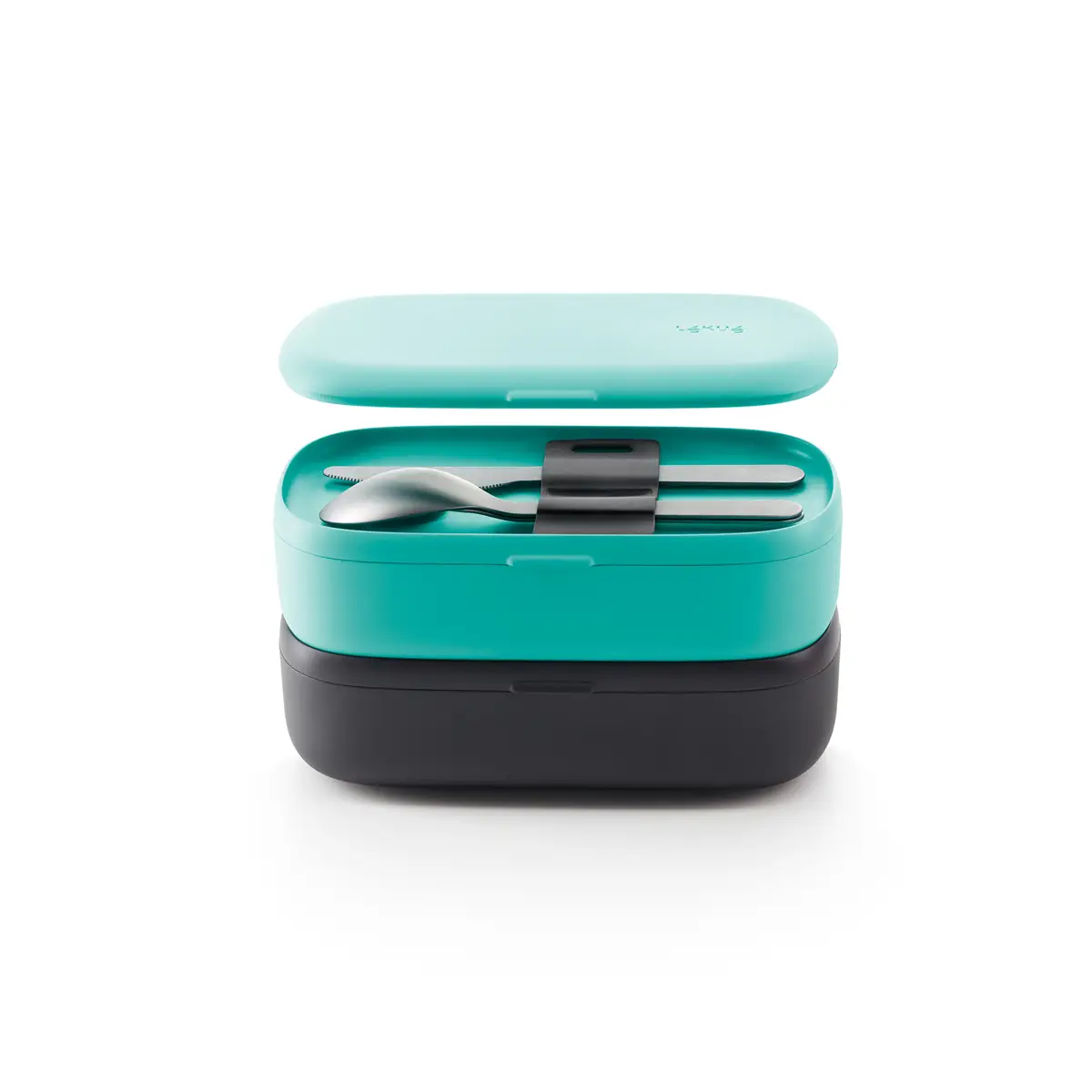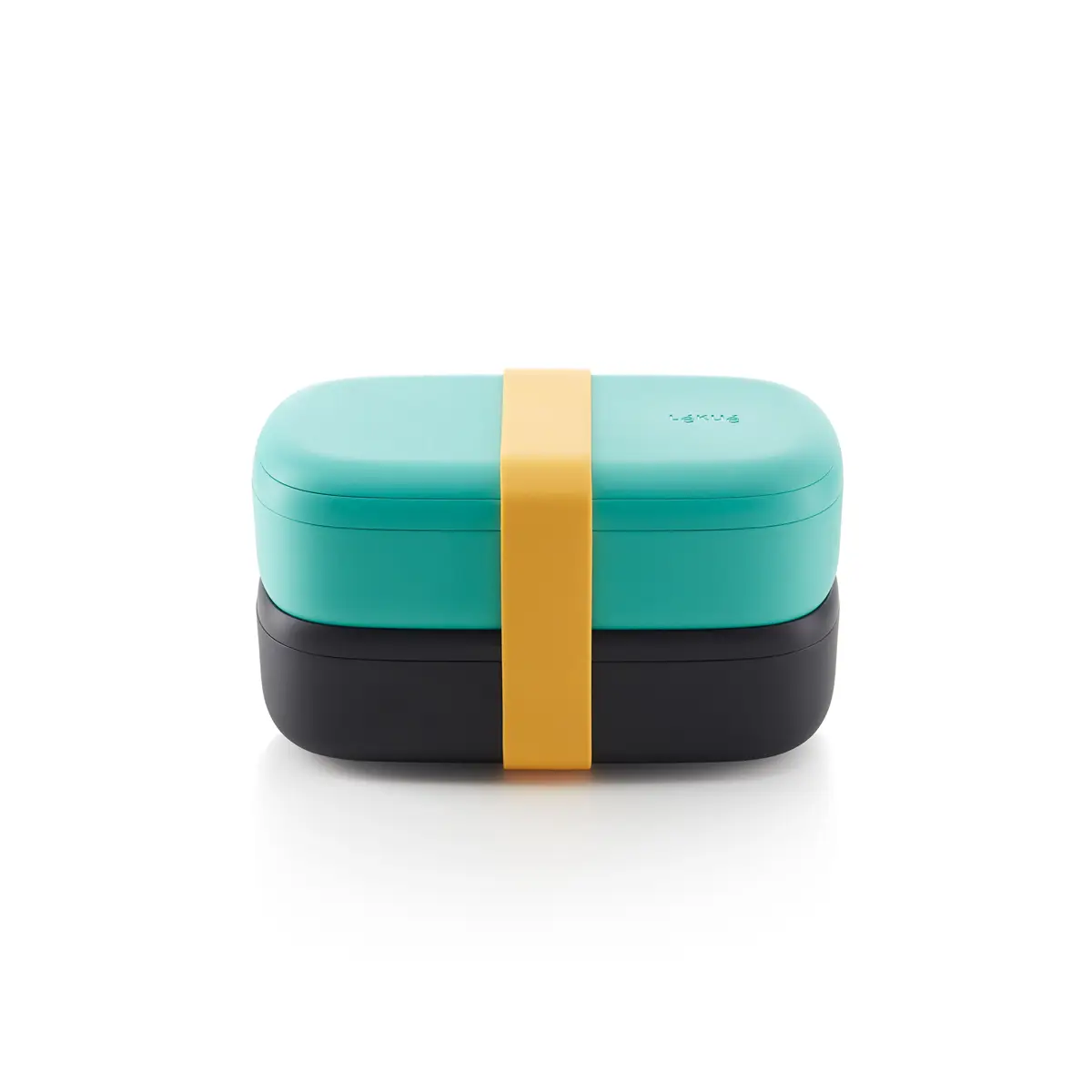 Lunchbox marki Leuke pochodzi z kolekcji TO GO, która stworzona została z myślą o osobach, które dbają o własne zdrowie i cenią sobie posiłki przygotowane przez siebie. Lunchbox składa się z dwóch pojemników o pojemności 500 ml każdy wraz z pokrywkami. Cały komplet połączony jest silikonową taśmą. Pojemnik wyposażony jest w górną pokrywę, dzięki której jest osobne miejsce na sztućce (nie są one częścią zestawu). W pojemnikach, można zmieścić 2-daniowy posiłek, podgrzać go w kuchence mikrofalowej i bezpośrednio z nich, bez przekładania, można zjeść potrawę. Podgrzewanie w mikrofalówce max 3 min. (w pojemnikach należy otworzyć specjalny silikonowy zawór). Nie należy używać pojemnika bezpośrednio na ogniu bądź innym źródle ciepła. Można przechowywać w lodówce, a także myć w zmywarce, na górnej półce. Podczas mycia nie używać ostrych zmywaków. Nie używać ostrych narzędzi. Produkt wolny od BPA.
