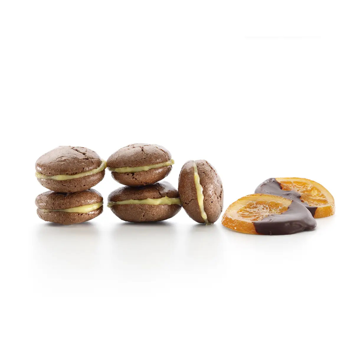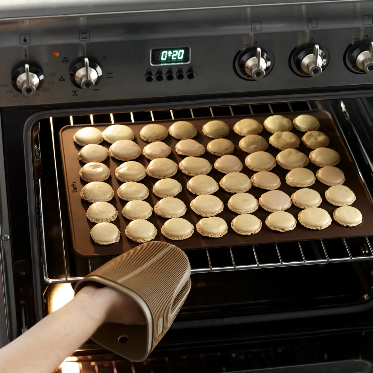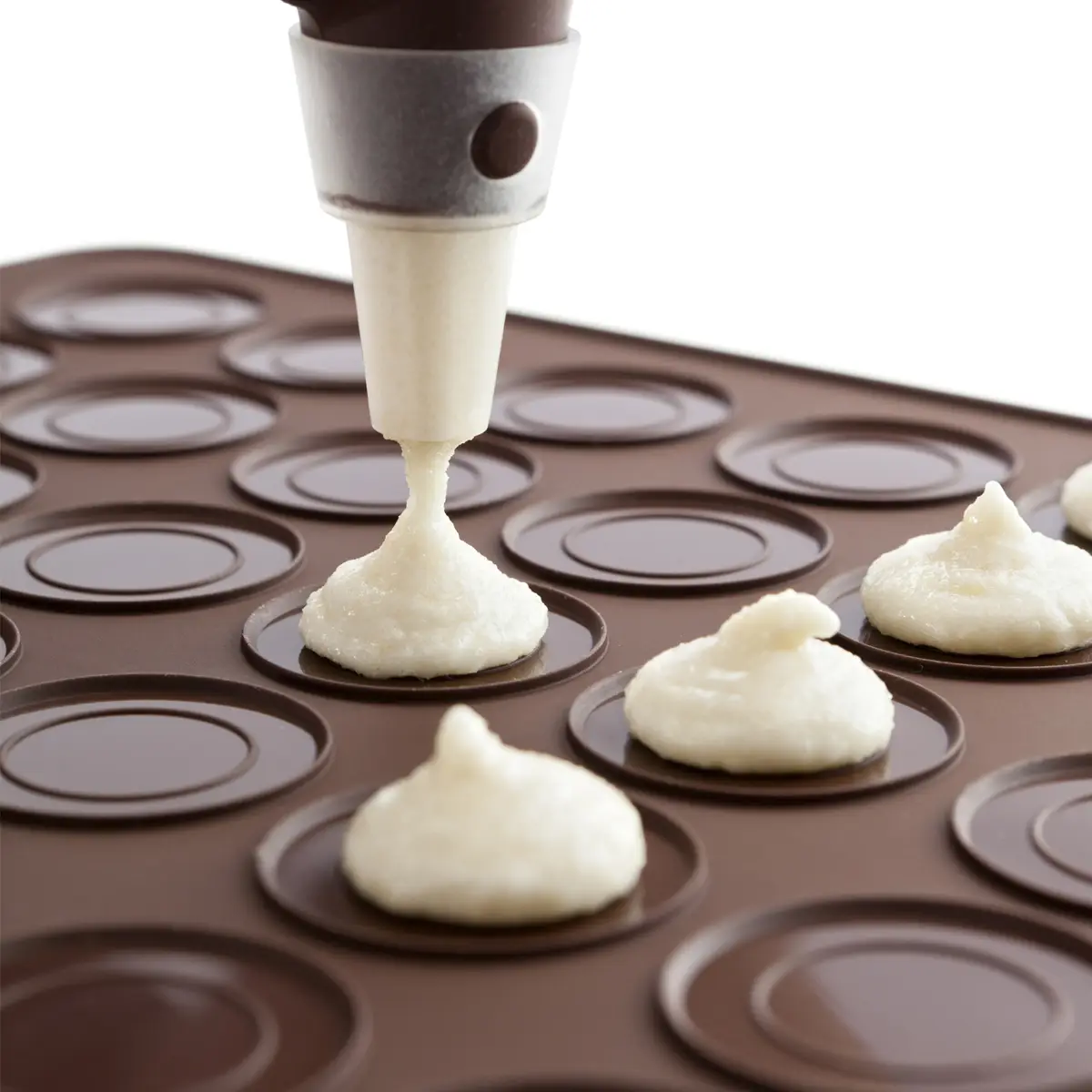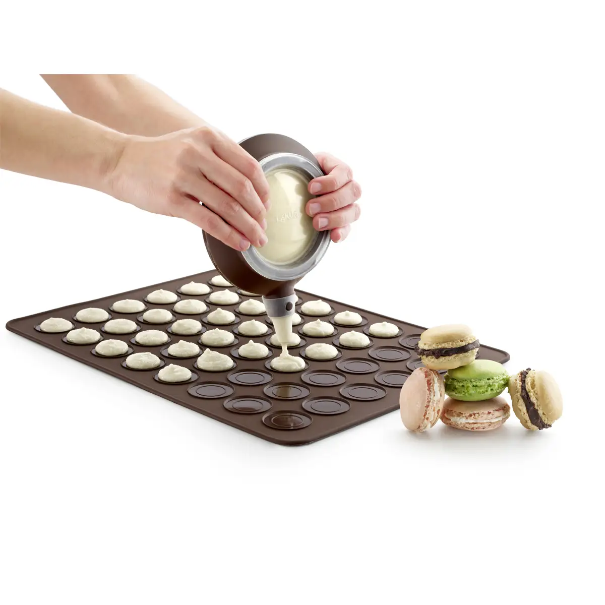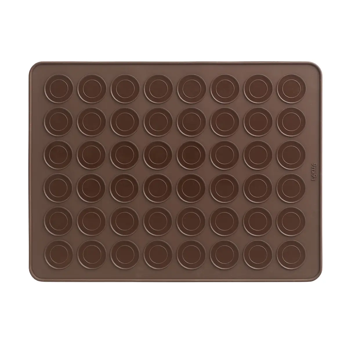 Wykonana z najwyższej jakości silikonu platinium mata marki Lekue służy do przygotowania słodkich makaroników - są to ciastka wykonane z z białek jaj, cukru pudru i mielonych migdałów. Posiada ona 48 wytłoczonych miejsc, co pozwala na przygotowanie 24 ciastek. Dzięki niej makaroniki mają idealny, okrągły kształt. Dzięki nieprzywieralnej powłoce upieczone ciasteczka bardzo łatwo zdejmuje się z maty. Można myć w zmywarce. Produkt wolny od BPA.