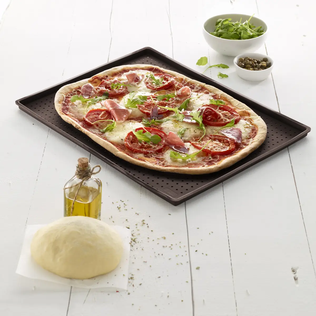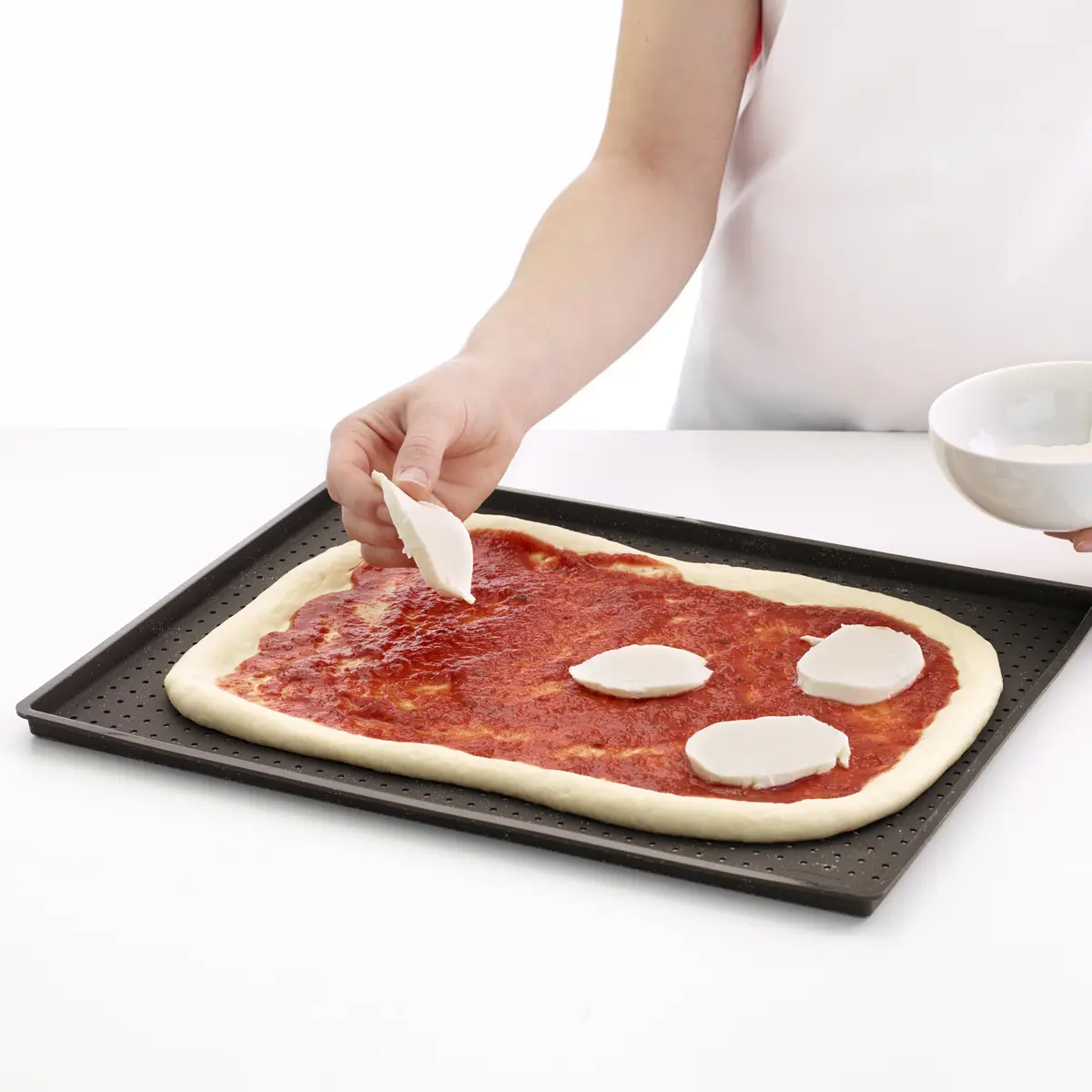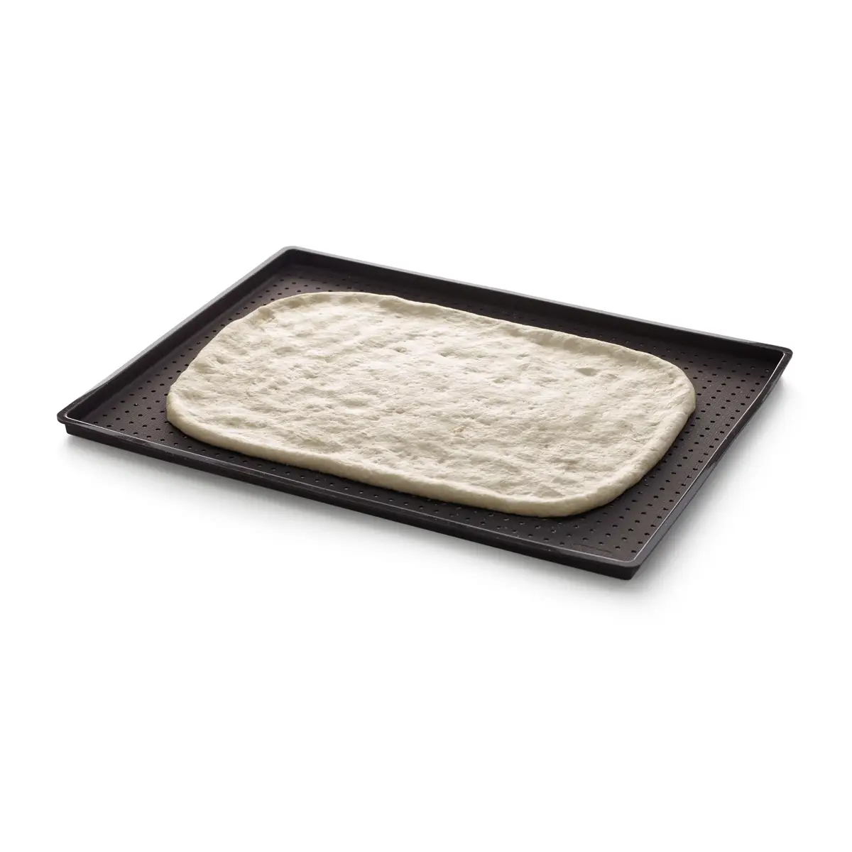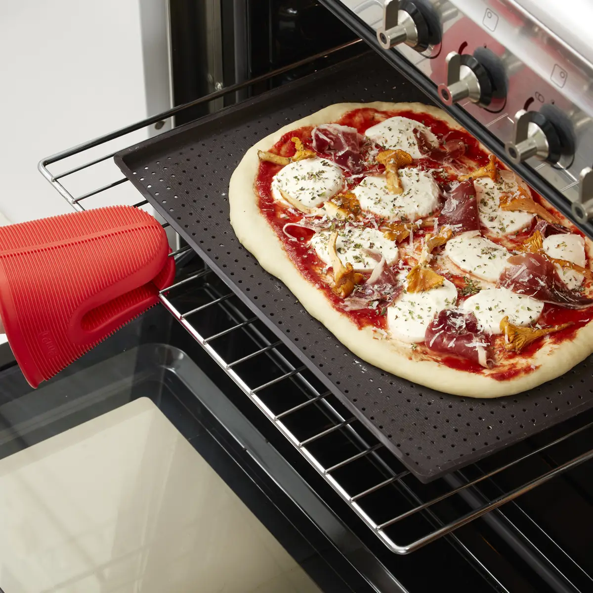 Silikonowa mata marki Lekue przeznaczona jest do pieczenia pizzy. Posiada ona mikro-perforowane dno, które zapewnia idealną cyrkulację powietrza, dzięki czemu ciasto zawsze wychodzi chrupiące. Forma posiada niewysoki rant, który pomaga dobrać grubość ciasta oraz zapobiega rozsypywaniu mąki po blacie. Nieprzywieralna powłoka nie wymaga użycia tłuszczu do pieczenia, ciasto łatwo odkleja się od jej powierzchni. Elastyczność materiału, z którego wykonany jest produkt ułatwia zarówno przyrządzanie ciasta, jak i przechowywanie nieużywanej maty (można ją zwinąć).