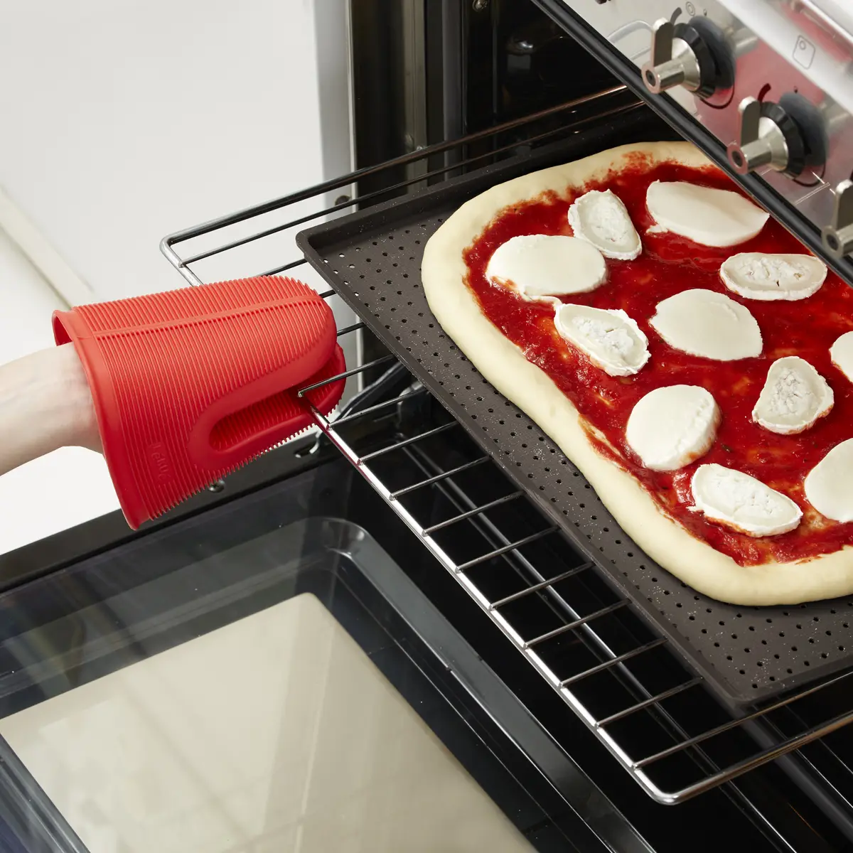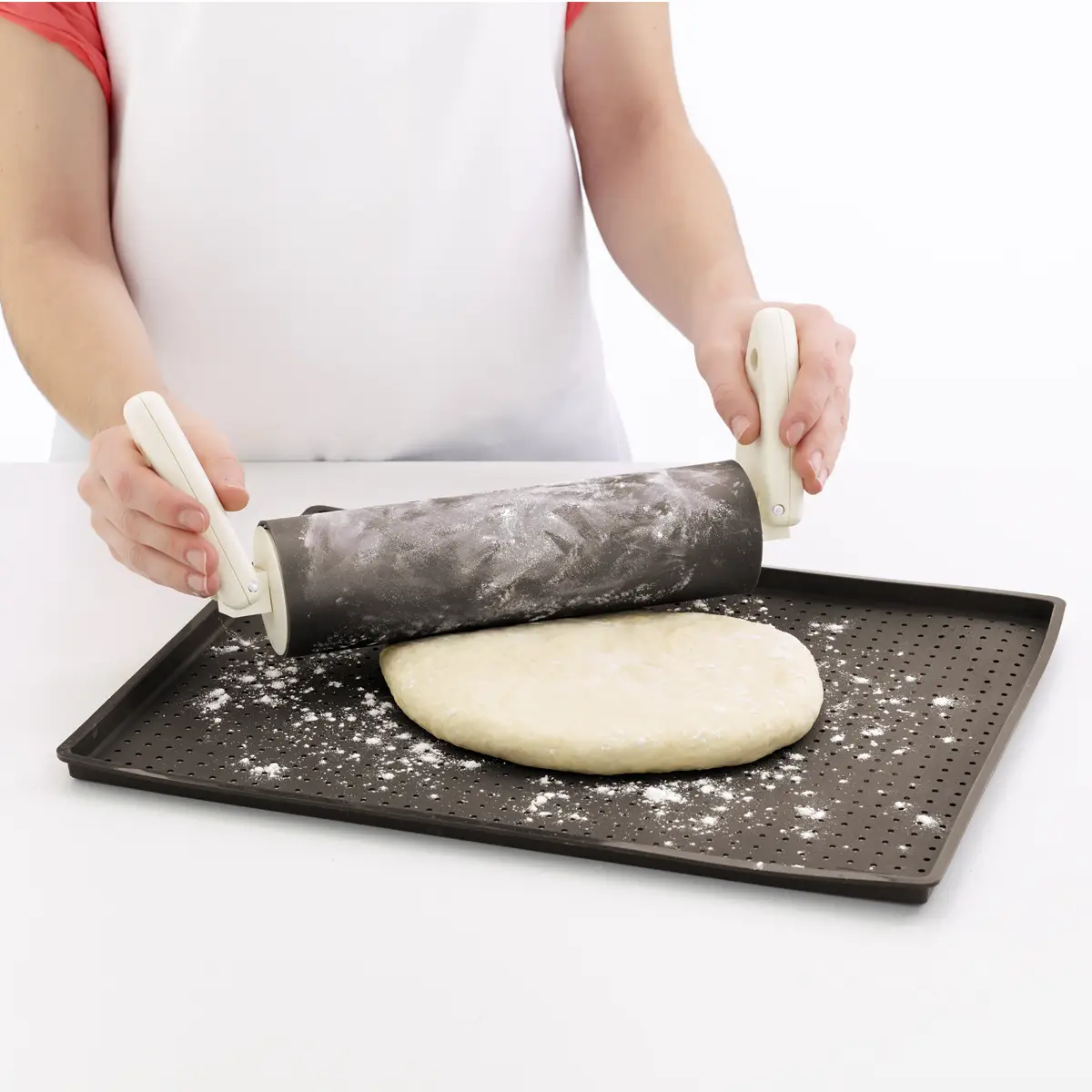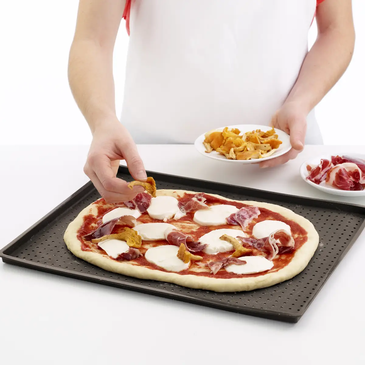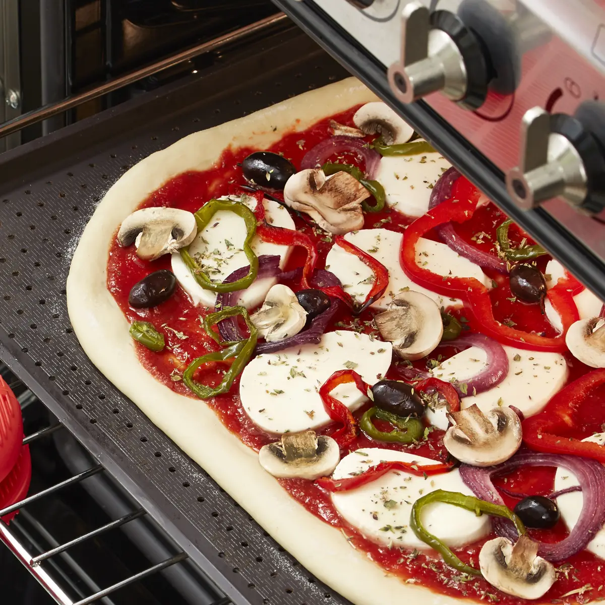 Silikonowa mata marki Lekue przeznaczona jest do pieczenia pizzy. Posiada ona mikro-perforowane dno, które zapewnia idealną cyrkulację powietrza, dzięki czemu ciasto zawsze wychodzi chrupiące. Forma posiada niewysoki rant, który pomaga dobrać grubość ciasta oraz zapobiega rozsypywaniu mąki po blacie. Nieprzywieralna powłoka nie wymaga użycia tłuszczu do pieczenia, ciasto łatwo odkleja się od jej powierzchni. Elastyczność materiału, z którego wykonany jest produkt ułatwia zarówno przyrządzanie ciasta, jak i przechowywanie nieużywanej maty (można ją zwinąć).
