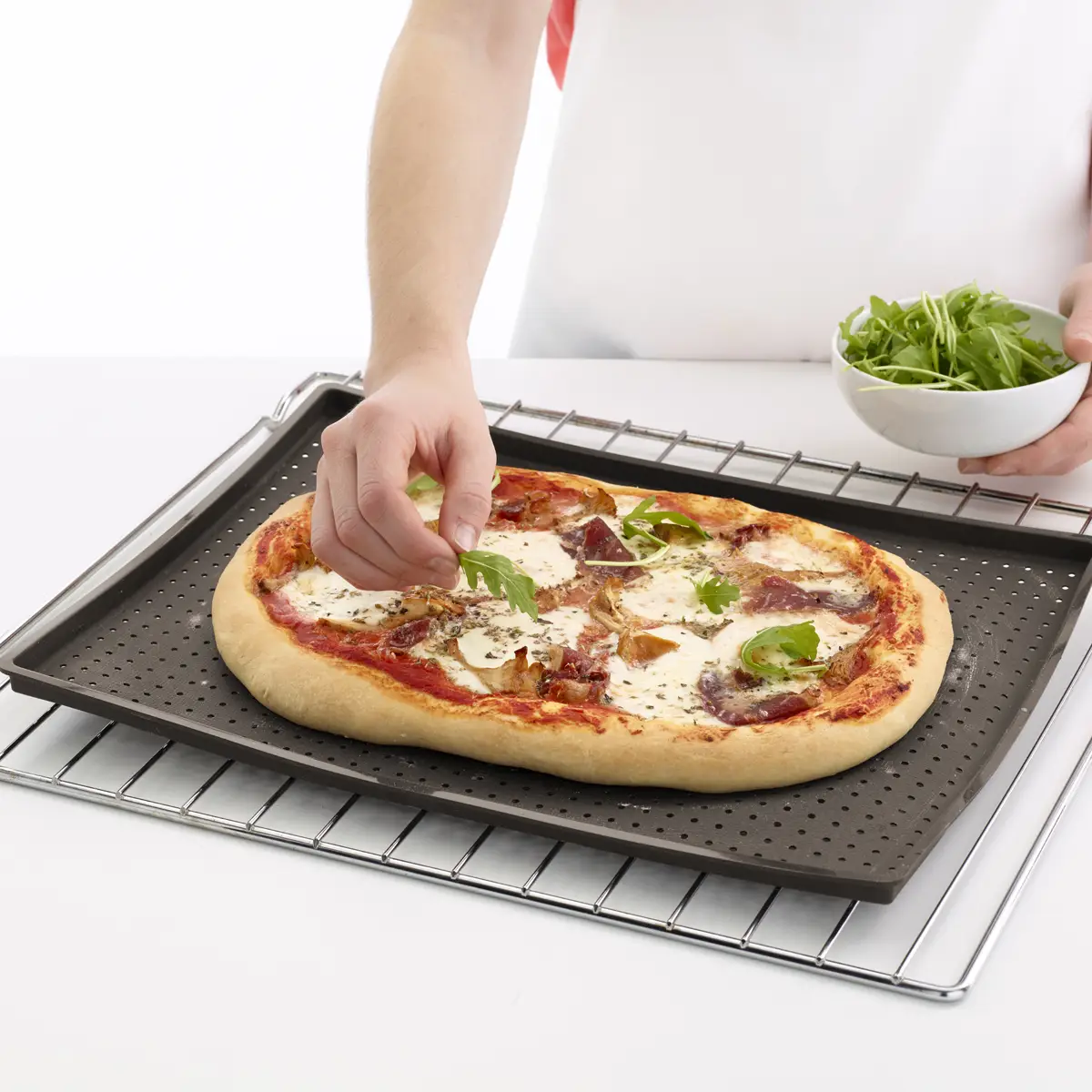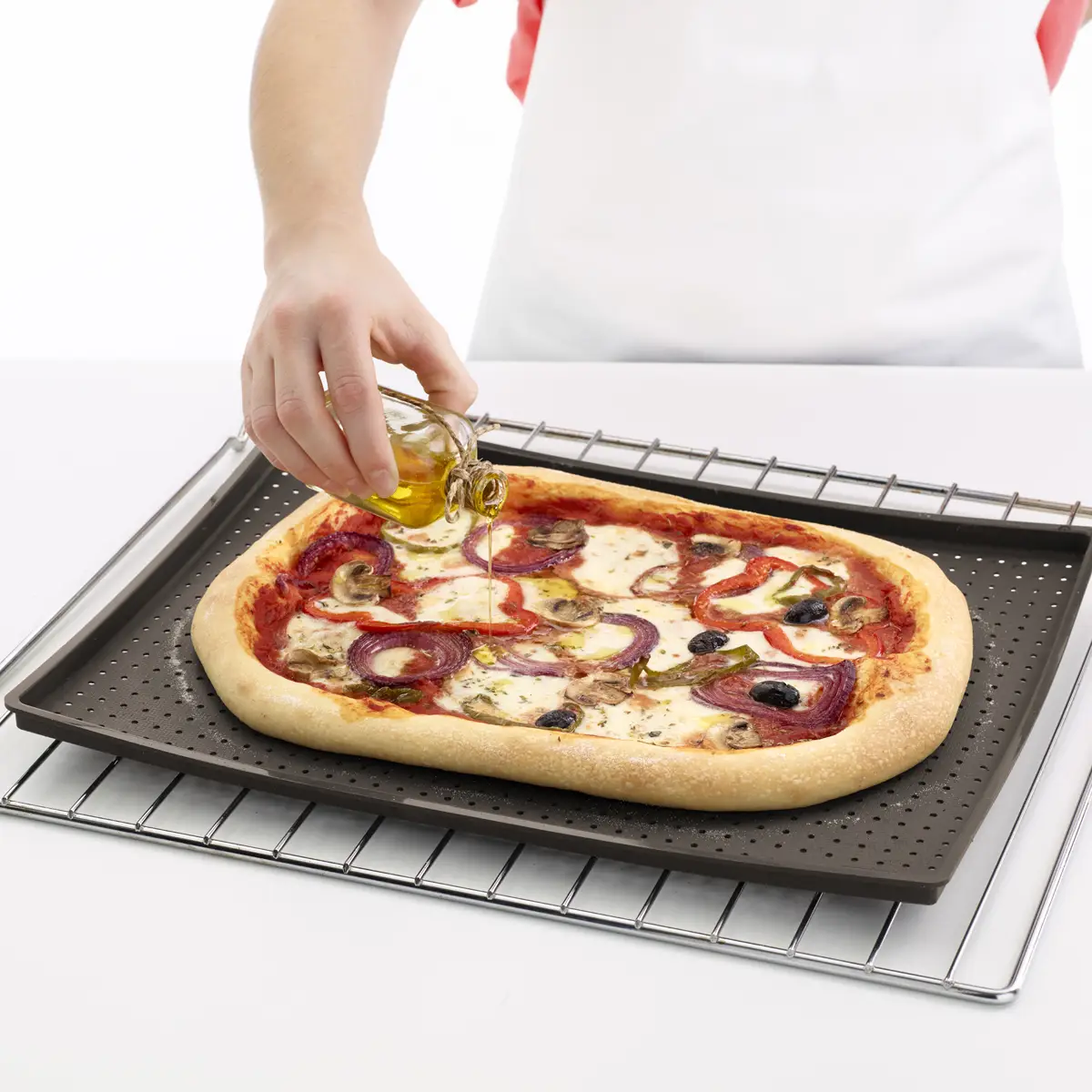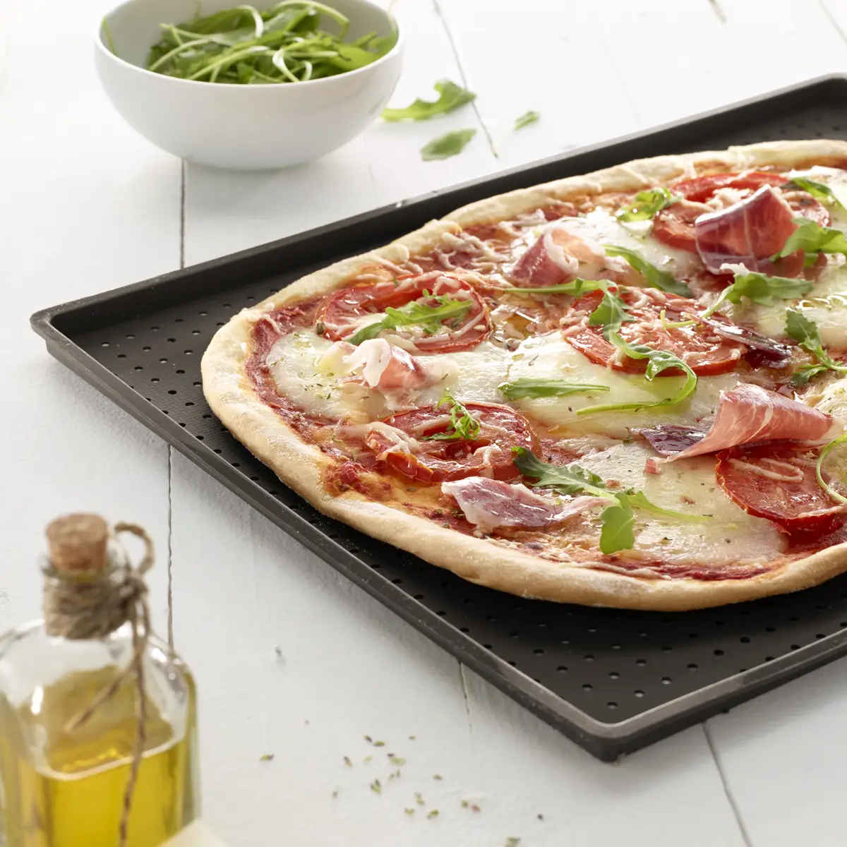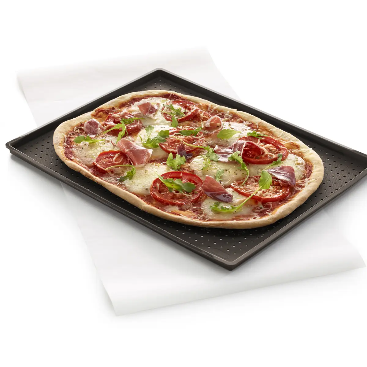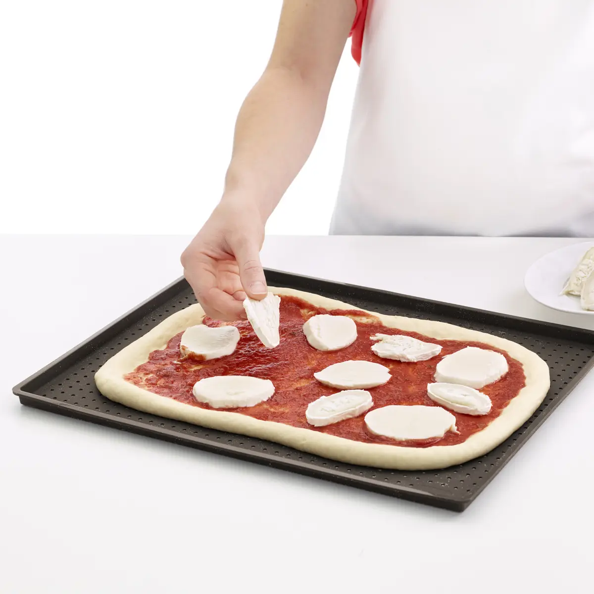 Silikonowa mata marki Lekue przeznaczona jest do pieczenia pizzy. Posiada ona mikro-perforowane dno, które zapewnia idealną cyrkulację powietrza, dzięki czemu ciasto zawsze wychodzi chrupiące. Forma posiada niewysoki rant, który pomaga dobrać grubość ciasta oraz zapobiega rozsypywaniu mąki po blacie. Nieprzywieralna powłoka nie wymaga użycia tłuszczu do pieczenia, ciasto łatwo odkleja się od jej powierzchni. Elastyczność materiału, z którego wykonany jest produkt ułatwia zarówno przyrządzanie ciasta, jak i przechowywanie nieużywanej maty (można ją zwinąć).