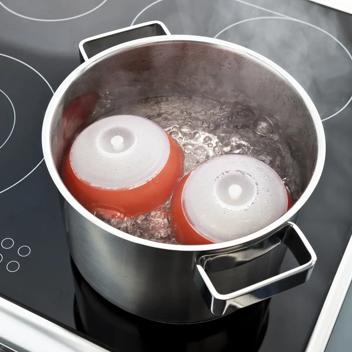 Zamknąć naczynie pokrywką i wstawić do garnka z wrzącą wodą lub do kuchenki mikrofalowej (w kuchence mikrofalowej naczynie należy ustawić bliżej brzegu obrotowego talerza).