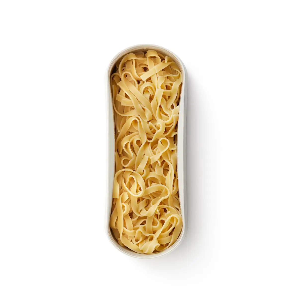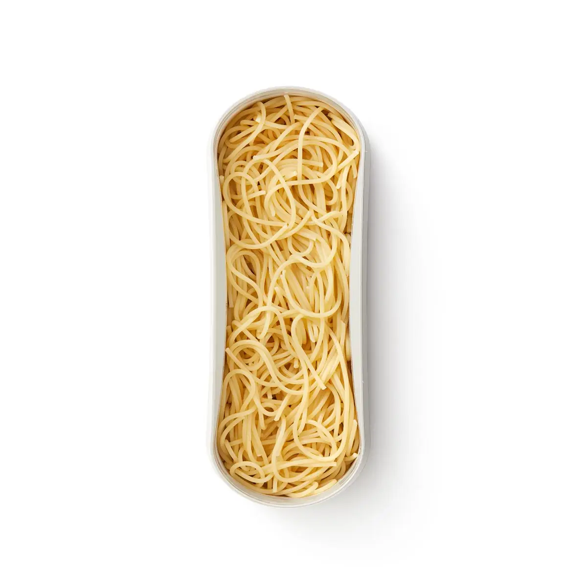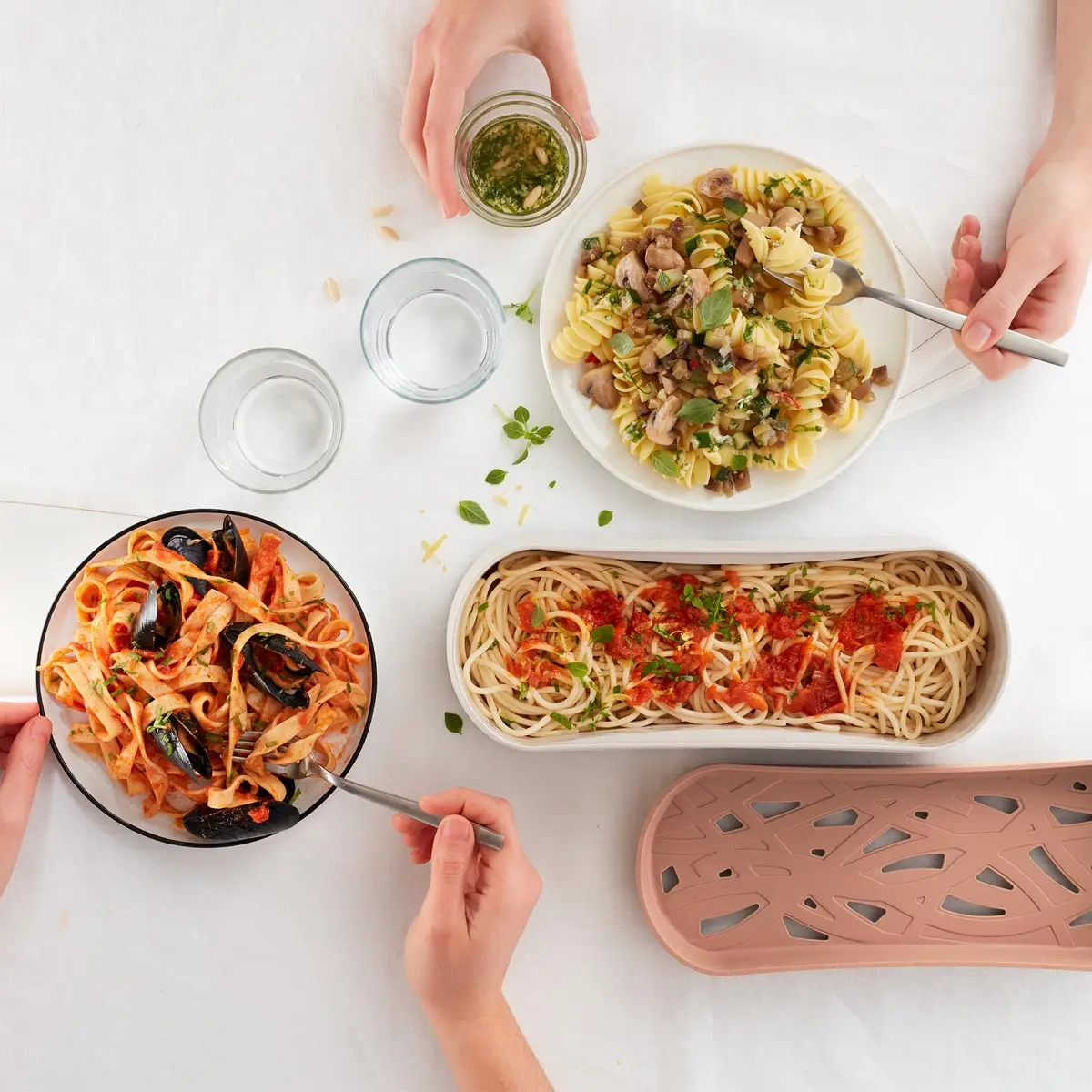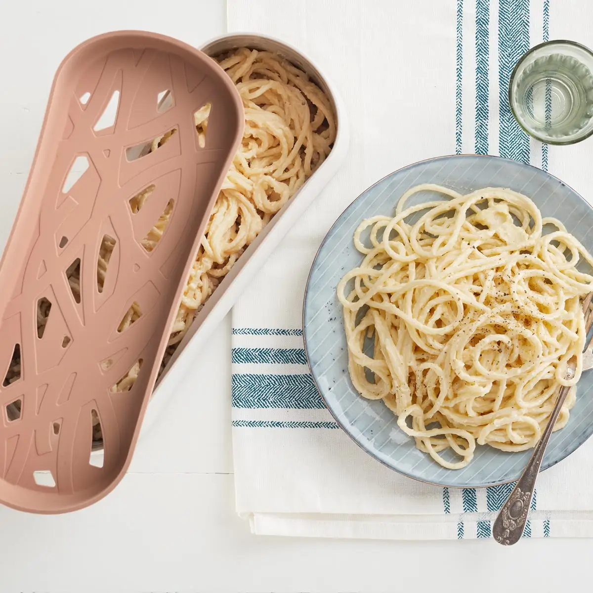 Naczynie marki Lekue o pojemności 1,5 litra służy do gotowania makaronu. Można w nim przygotować każdy rodzaj makaronu od spagetti po nadziewane raviolli. Naczynie zostało stworzone z myślą o ludziach zabieganaych. Może służyć zamiast miarka do makaronu, garnek, durszlak, patelni do przygotowania sosu, a także jako miska do serwowania gotowego dania.