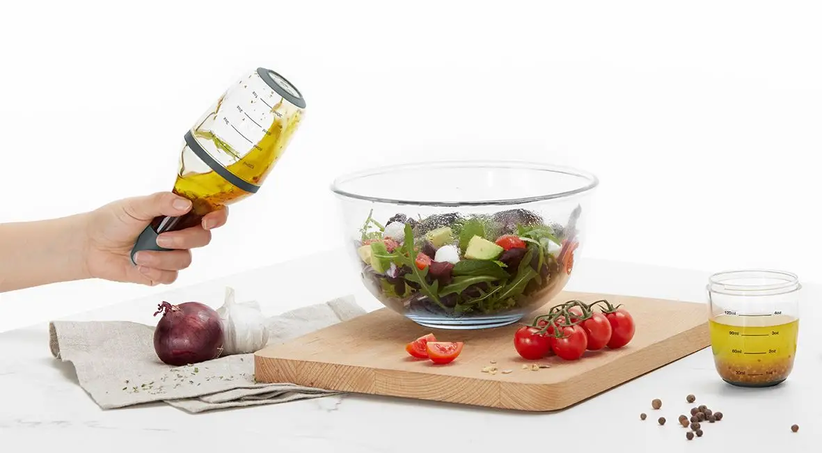 - Shaker do sosu sałatkowego ma duży otwór umożliwiający dodawanie składników i bezpieczną silikonową pokrywkę, która zapobiega przeciekaniu.