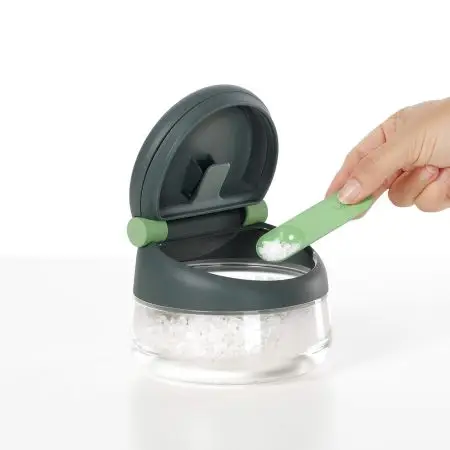 - Zawiera również łyżkę pomiarową, idealną do dokładniejszych przepisów, takich jak ciasto i desery. Łyżka zatrzaskuje się w pokrywce, gdy nie jest używana, więc nie przeszkadza ani nie gubi się.
